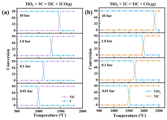 Figure 2 displays the equilibrium composition distribution of Equations (1) and (2) under different partial pressures. As the gas-phase pressure increases, the reactions become less favorable. Figure 2b demonstrates that the equilibrium temperature for Equation (2) must significantly exceed 1600 °C. Consequently, this reaction cannot proceed at 1600 °C in an argon atmosphere, which aligns with the results shown in Figure 1.