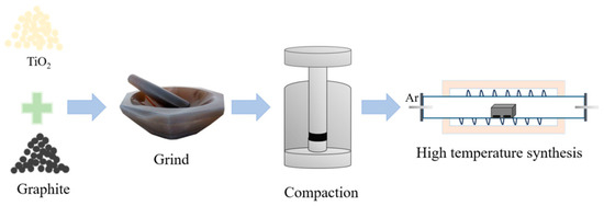 The raw materials are weighed in proportion and then ground in a mortar to obtain a uniform mixture of evenly mixed TiO2 and graphite powder. In general, compaction can increase the effective contact area between the mixture, thereby speeding up the reaction process and shortening the reaction time. Therefore, in this experiment, we used an electric tablet press (DYPD-30T) to press the above evenly mixed powder. The mold material used was stainless steel, the shape of the press block was a round cake, the diameter was 12.5 mm, the mass of each sample was 1.2 ± 0.05 g, and the pressure was set to 100 MPa. The pressed sample is placed in a graphite crucible with a graphite lid and then sintered in a tubular sintering furnace. The sintering process was carried out at 1600 °C in high purity argon atmosphere (flow rate was 25 mL/min), and the holding time was 4 h. Cool to room temperature to obtain the target product.