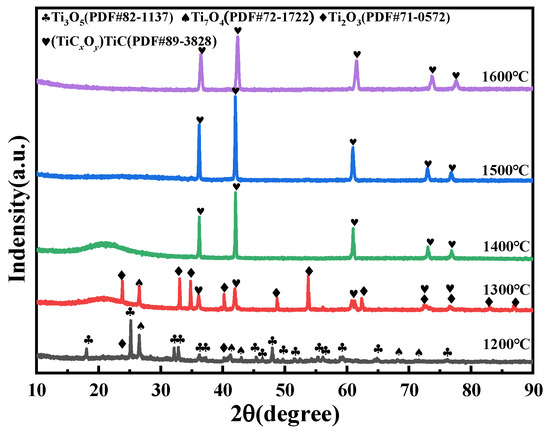 To investigate the effect of temperature on the sintered products, samples with a molar ratio of TiO2 to graphite of 1:2.0 were sintered at different temperatures, all held for 4 h. The XRD patterns of the resulting products are shown in Figure 4. The results indicate that the reduction begins at ~1200 °C with the formation of lower titanium oxides (e.g., Ti3O5) through a solid-state reaction. The formation of titanium oxycarbide (TiCxOy) is a critical intermediate step, and its composition evolves as oxygen is progressively replaced by carbon. The reduction sequence will be described as a progressive process: TiO2 → TinO2n−1 (Magnéli phases) → TiO → TiCxOy. We will compare our findings with established mechanisms from key literature sources [22]. This will demonstrate that our experimental results are consistent with the known stepwise reduction mechanism.