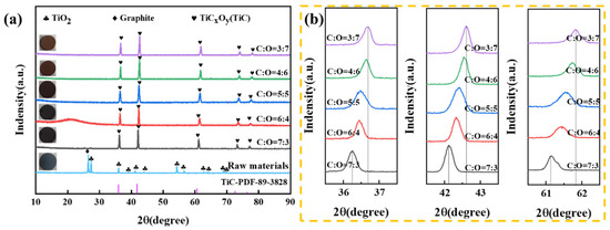 (a) XRD patterns of TiO2 and graphite mixtures with different molar ratios held at 1600 °C in argon atmosphere for 4 h; (b) Diffraction peak displacement of TiCxOy phase.