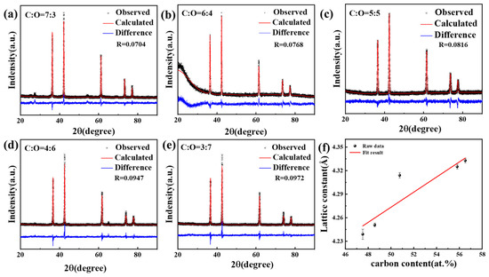 (a–e) The finishing curves and lattice parameters of TiCxOy (Ti/C molar ratios: 1:2.4, 1:2.2, 1:2.0, 1:1.8 and 1:1.6); (f) Analysis plot of lattice parameter versus carbon content.