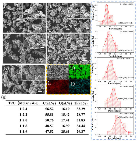 Microstructure and composition test results of TiO2 and graphite mixtures with different molar ratios after being held at 1600 °C in argon atmosphere for 4 h. (a) 1:2.4 (b) 1:2.2 (c) 1:2.0 (d) 1:1.8 (e) 1:1.6 (f) Elemental distribution diagram of the product when the raw material ratio was 1:2.0 (g) EDS component detection results in each region (h) Size distribution of TiCxOy.