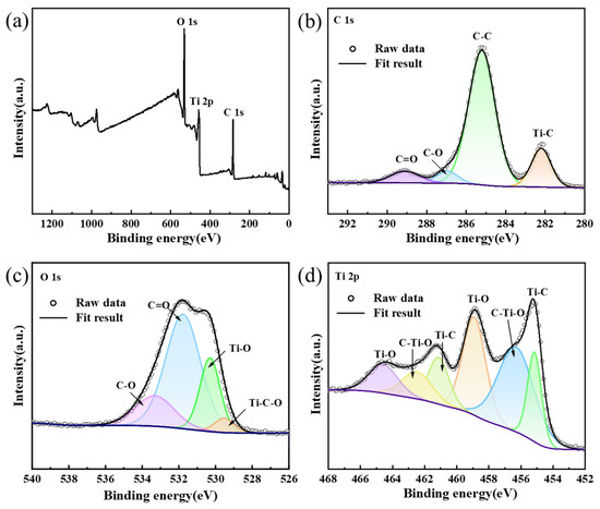 X-ray photoelectron spectroscopy (XPS) was performed on the prepared TiC0.5O0.5 sample to analyze the existence of titanium and its interactions with carbon and oxygen, with the objective of enhancing comprehension of the titanium valence state in TiCxOy. The obtained results are presented in Figure 9. The measurement spectrum shown in Figure 9a shows the presence of Ti, C, and O elements in the sample, which is consistent with the EDS analysis results shown in Figure 8. The binding energies of all elements were calibrated by C1s (284.8 eV), and the binding forms of each element could be expressed in more detail by fitting the narrow spectrum. According to reports in relevant literature [26], the highest peak of the four peaks in the C1s region corresponds to the C-C bond [27], the peak at 282.18 eV corresponds to the C-Ti bond, and the peak at 286.98 eV and 289.18 eV corresponds to the C-O and C=O bond respectively [28]. The existence of C-Ti bonds and C-O bonds suggests the formation of composite TiCxOy solid solutions. Since the binding energy of metal oxides is about 530 eV, and that of metal carbon oxides is about 528 eV [29,30], in the O 1s region shown in (c), the peak at 530.28 eV corresponds to the Ti-O bond, and the peak at 529.48 eV corresponds to the Ti-C-O bond. The remaining two peaks correspond to the C-O and C=O bonds, respectively. The spectrum shown in (d) is the XPS spectrum of Ti 2p, and the three main characteristic peaks corresponding to Ti-O, C-Ti-O and Ti-C respectively [29,31,32]. The existence of Ti-C and Ti-O bonds indicates that the TiCxOy solid solution within the composite structure leads to various bonding configurations of titanium.