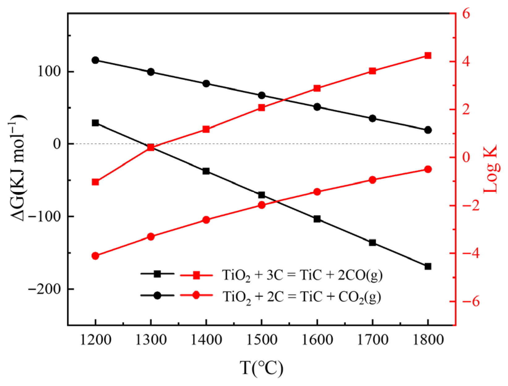 Figure 1 shows the relationship between temperature and Gibbs free energy (ΔG) and equilibrium constant (log K) of TiO