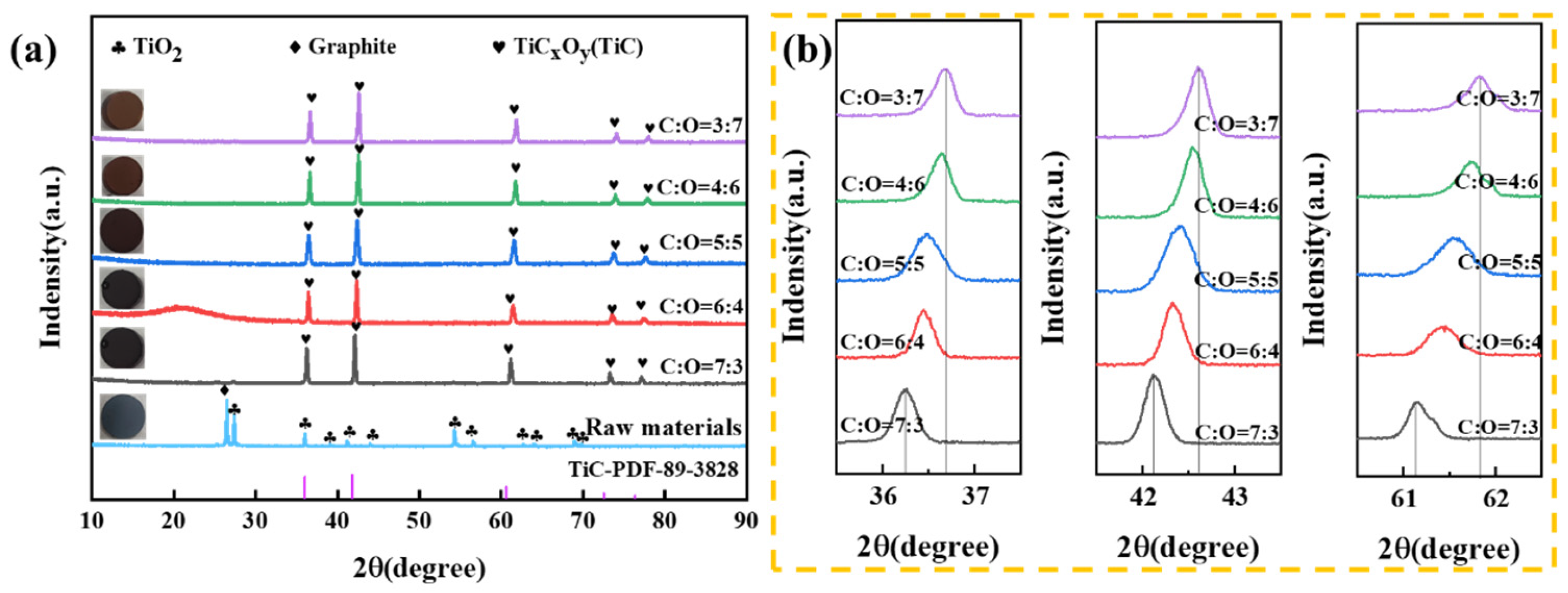 2 and graphite were 1:2.4, 1:2.2, 1:2.0, 1:1.8 and 1:1.6, respectively (The carbon-to-oxygen ratios are 7:3, 6:4, 5:5, 4:6 and 3:7, respectively). Furthermore, there was a notable alteration in the color of the sintered sample, transitioning from gray to reddish-brown as the C content diminished [