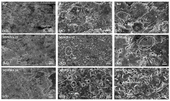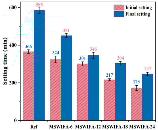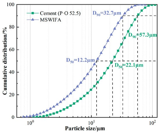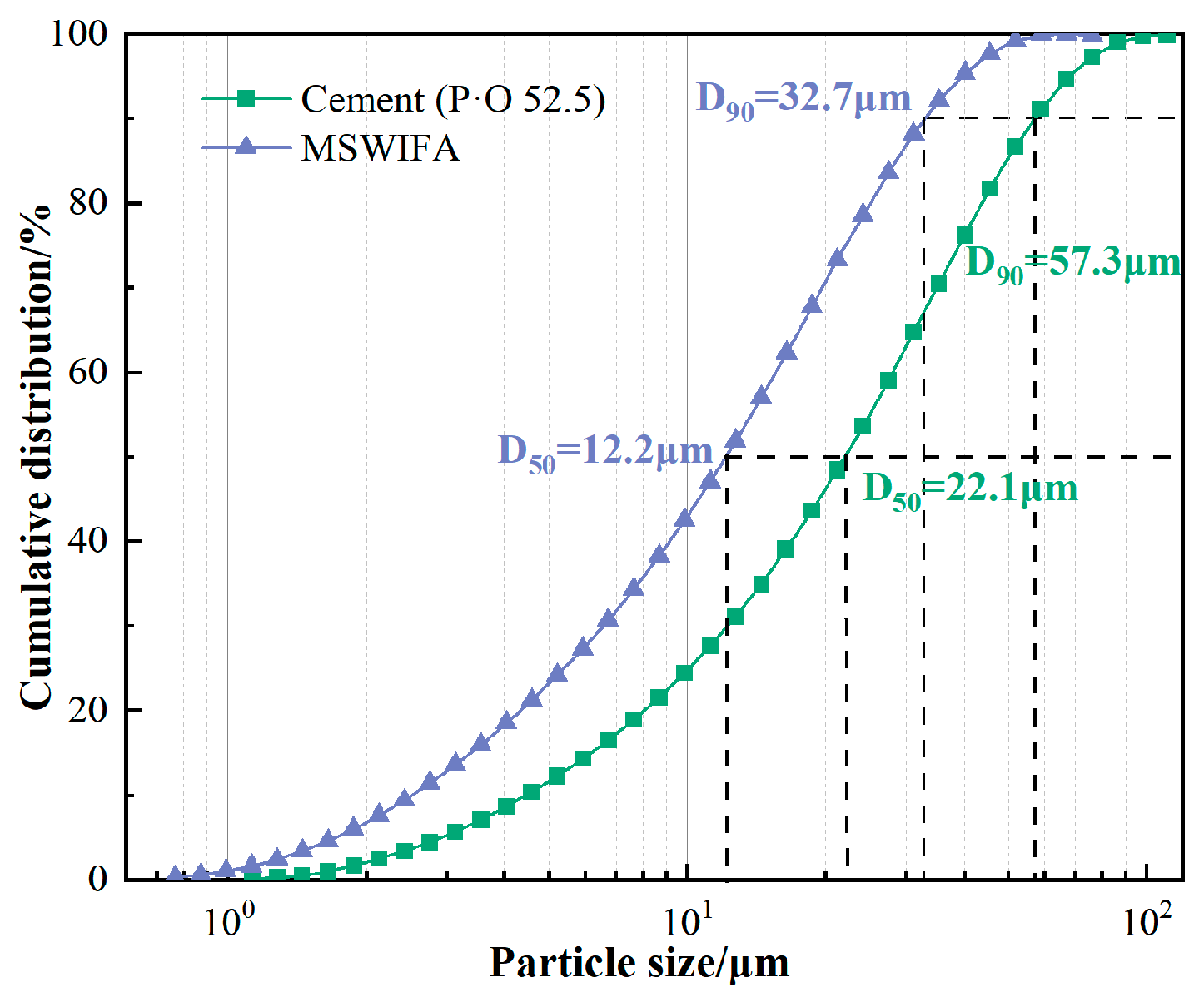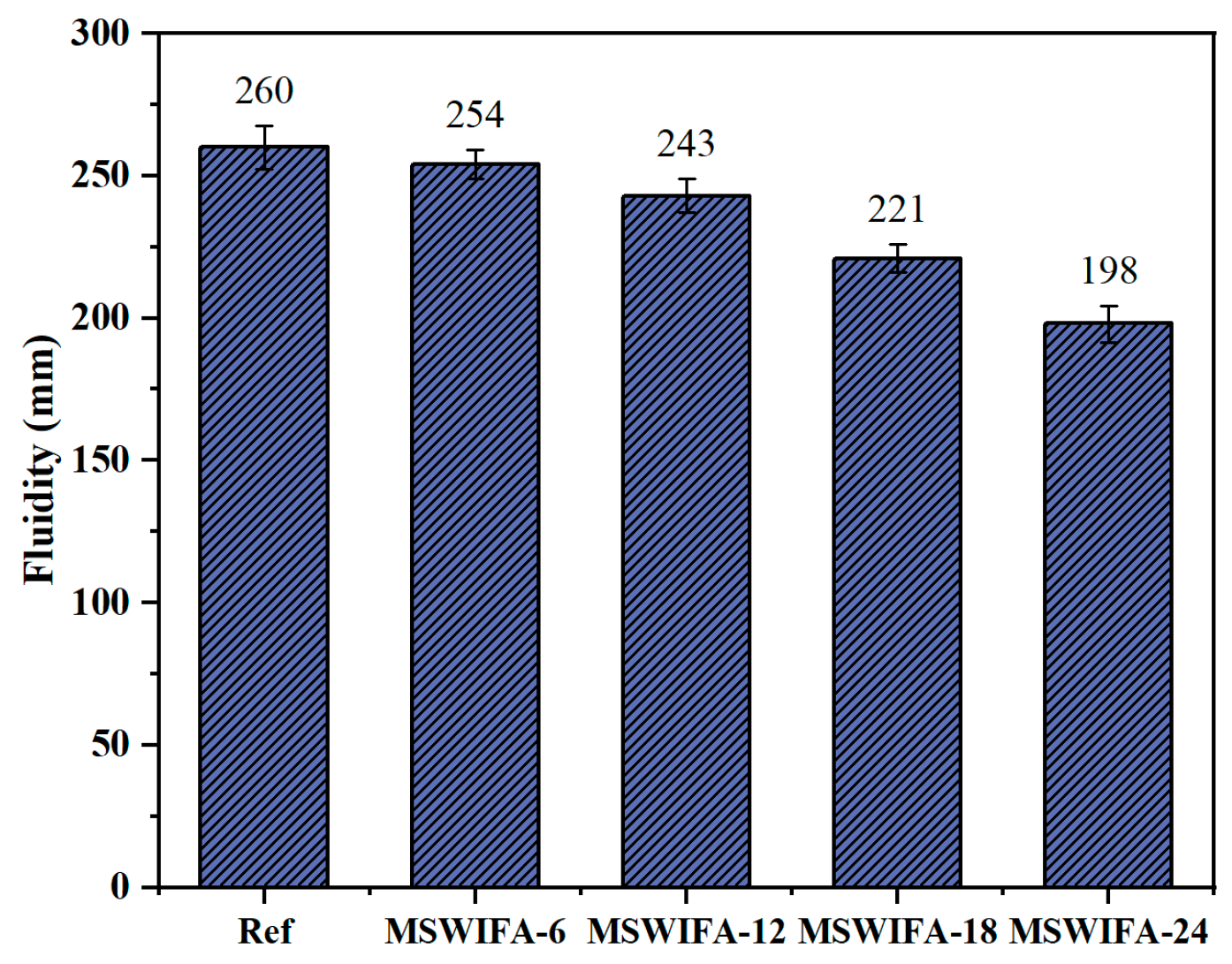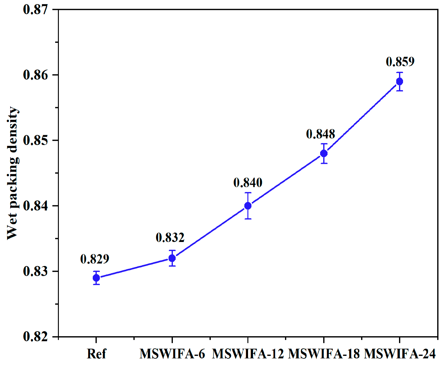 - Incorporating silica fume alone at ≤6% improves fluidity; at 10% it significantly increases 28-day compressive strength through micro-filler action and C-S-H densification. Ground slag at ≤20% used singly prolongs setting, enhances pumpability and offsets flow loss; at 30% it slightly reduces early strength but surpasses the reference at 56 days. MSWIFA particles exhibit a coarse texture and a large specific surface area. The partial replacement of cement with MSWIFA in UHPC leads to a decrease in fluidity, a reduction in setting time, and an increase in wet packing density.