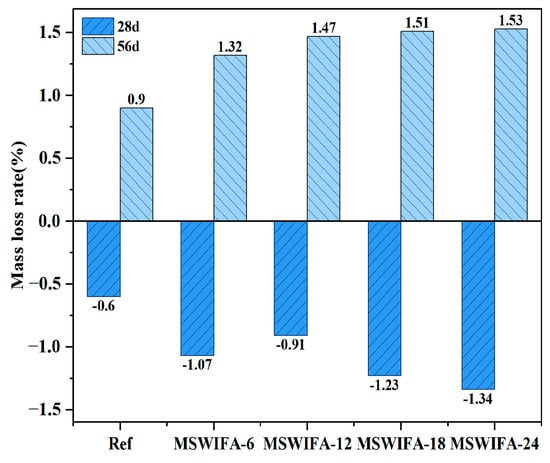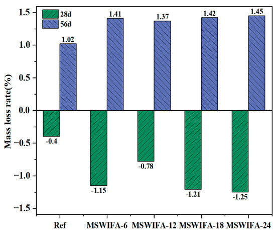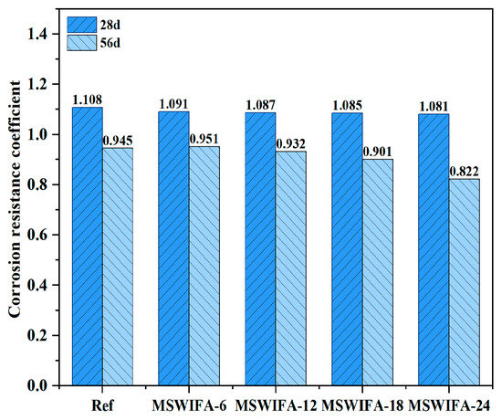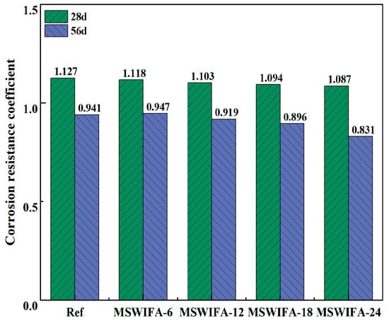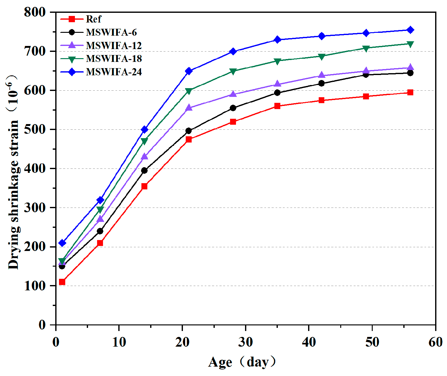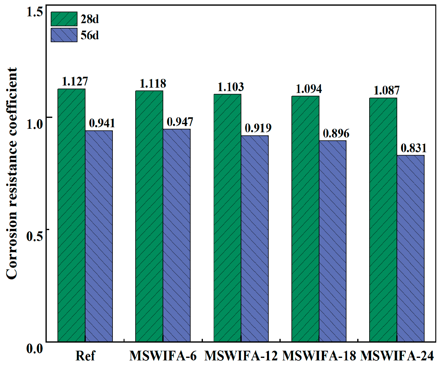 - The incorporation of MSWIFA increases the drying shrinkage of UHPC. After immersion in chloride and sulfate solutions, both mass and compressive strength of UHPC exhibit an initial increase followed by a subsequent decrease. The corrosion coefficient demonstrates positive values at 28 days but turns negative at 56 days. The maximum mass loss rate after immersion in both solutions reaches 1.53%, while the maximum corrosion coefficient attains 1.127. At a 24% replacement rate, MSWIFA-UHPC displays excellent resistance to chloride ion penetration and sulfate attack.