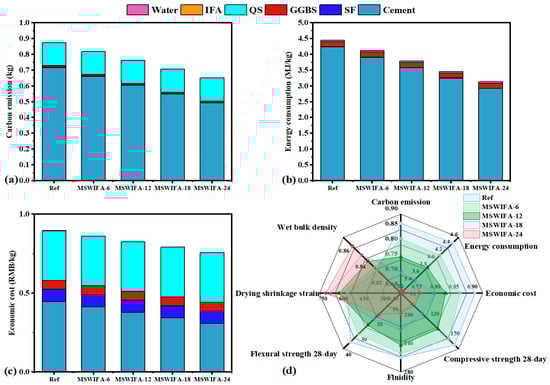- The substitution of cement with MSWIFA in UHPC resulted in reductions of 7.42–29.73% in energy consumption, 6.38–25.51% in CO2 emissions, and 2.56–15.38% in cost. This MSWIFA replacement strategy demonstrates significant synergistic environmental and economic benefits, facilitating efficient resource utilization and providing a feasible pathway for the green and low-carbon transformation of UHPC.