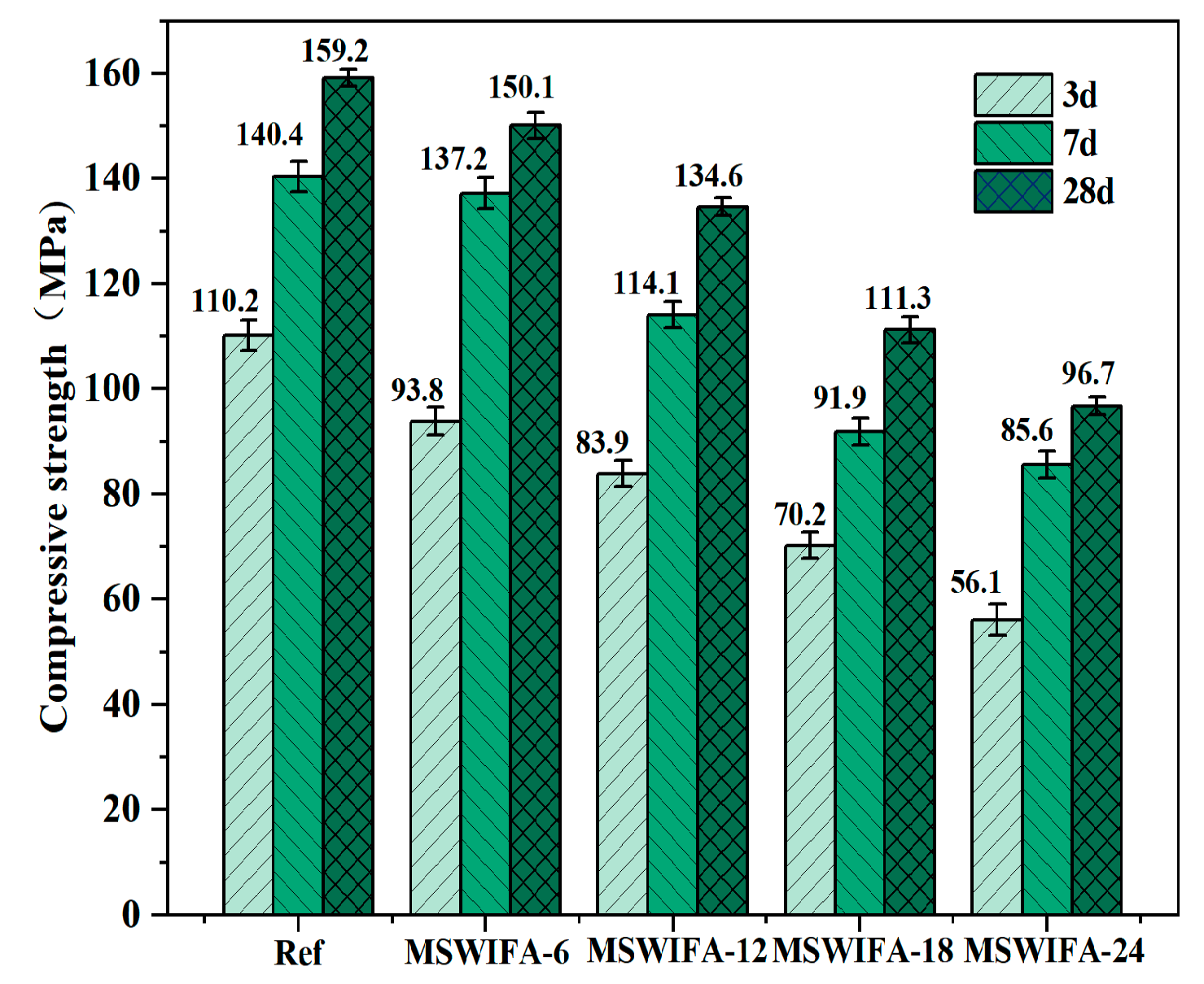 - This study shows that up to 12 wt% MSWIFA can be incorporated into UHPC. Furthermore, the resulting UHPC maintains a compressive strength above 120 MPa and immobilizes heavy metals to meet both Chinese and EU leaching limits.