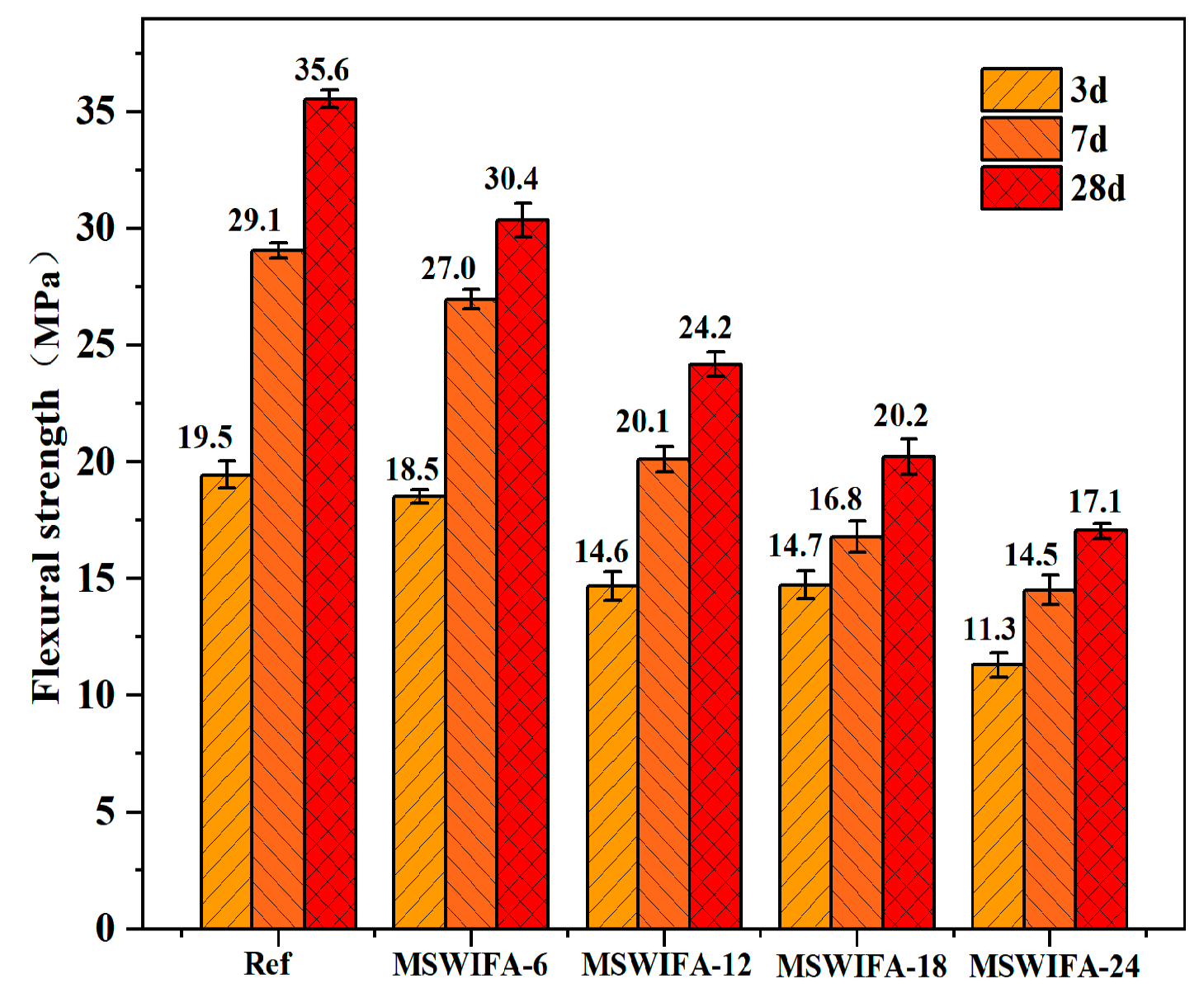 - The substitution of cement with MSWIFA adversely affects the mechanical properties of UHPC. Specimens from the MSWIFA-6 and MSWIFA-12 groups attain 28-day compressive strengths of 150.1 MPa and 134.6 MPa, respectively, alongside flexural strengths of 30.4 MPa and 24.2 MPa at the same curing age. Within the substitution range of 12%, these mechanical properties satisfy the requirements for UHPC. Specimens in the MSWIFA-18 and MSWIFA-24 groups exhibit 28-day compressive strengths of 111.3 MPa and 96.7 MPa, respectively. Within a 24% replacement rate range, their mechanical properties meet the requirements for HPC.
