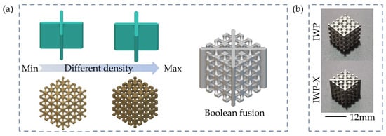 (a) Boolean fusion of IWP-X lattice structures; (b) the SLM specimens for IWP and IWP-X lattice structures.