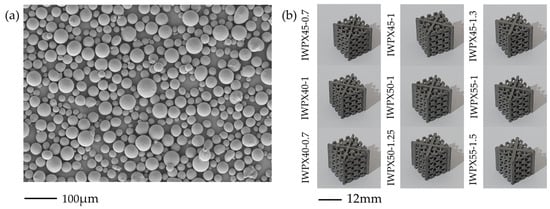 A total of nine new structures were designed, including three structures with the same density (IWP45-0.7, IWP45-1, and IWP45-1.3), three structures with the same thickness of plate (IWP40-1, IWP50-1, and IWP55-1), and three structures with the same volume of I-WP surface structure (IWP40-0.7, IWP50-1.25, and IWP55-1.5). These structures were compared with the original I-WP structure. As shown in Figure 1b, the I-WP surface structure is generated by MATLAB R2023b software, and the plate structure is generated by SolidWorks 2020 software. We control the volume of IWP by turning the boundary constant c, and the volume of the structures is measured by the Materialise Magics 24.0 software. In this paper, relative density is related to volume: