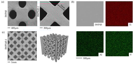 Characterization results of SLM-produced specimens: (a) SEM images of the IWP45 and IWPX45-1 specimens; (b) EDS element distribution images of specimens; (c) micro-CT images of the IWPX45-1 specimen.