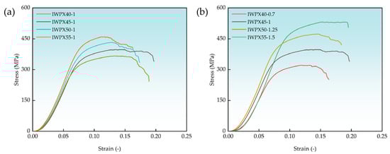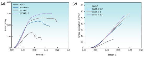 The stress–strain curves for the same plate thickness fused with different densities of IWP surface structures are shown in Figure 7a. The plate-to-IWP volume ratio decreases as the density of the IWPX increases. The curves end at the rupture of the axial structure of the sample. As the density of IWPX increases, the compressive strength is enhanced, but after the relative density exceeds 0.45, the fracture strain of IWPX shows a clear tendency to decrease, which is due to the weakening of the deformation resistance of the structure [].