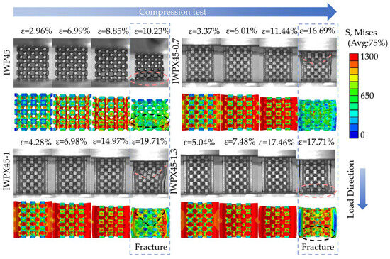 The structures deform uniformly before compression begins to 6%. IWP45 reaches the yield point at compressive strains up to 6.99%. At compression to 10.23%, IWP45 starts to collapse layer by layer from the lower layers. This is the same way that IWP structures fracture in the other literature []. For the IWPX structure, due to the plate reinforcement, IWPX45-0.7 and IWP45X-1 are gradually deformed by the bending of the plate structure after compression above the ultimate compression stress point. The IWPX45-0.7 structure, which has the smallest plate-to-IWP volume ratio, begins to fracture at compression to 16.69%, showing a V-shaped shear fracture, which is different from IWP45. At compression to 17.71%, the lower layer of IWPX45-1.3 fractured, which was due to an over-representation of the plate structure. At 19.71%, IWPX45-1 fractures with the same pattern as IWPX45-0.7. The result of the compression test suggests that the plate structure can enhance the fracture strain of the IWP structure, and that changing the percentage of the plate structure will change the fracture mode of the structure.
