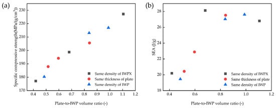 (a) Relationship of specific compressive strength versus volume ratio; (b) relationship of SEA versus volume ratio.