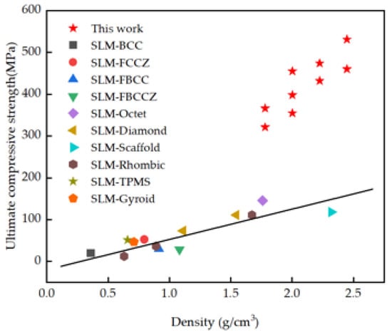 The comparison of ultimate compressive strength between IWP-X and other Ti6Al4V lattice structures printed by the SLM [,,,,,] machine is shown in Figure 9, and the red five stars represent the IWP-X structure of this work. The ultimate compressive strength of the IWP structure with the same relative density is higher than the other structures. It shows that the fused X-shaped plate structure has a great improvement in the material properties in the axial direction.