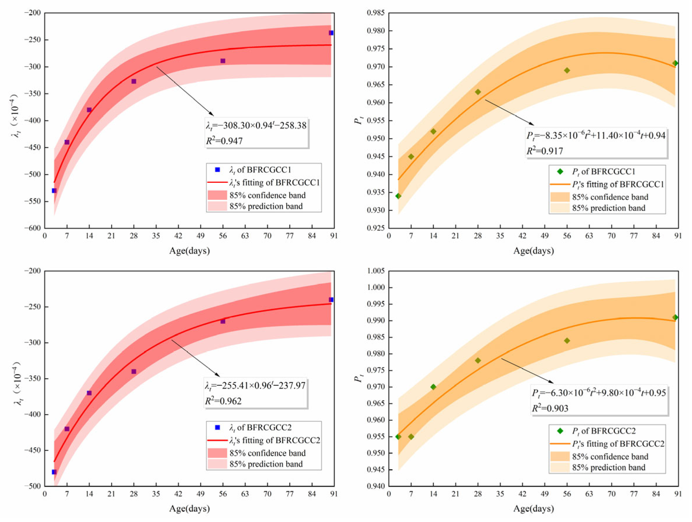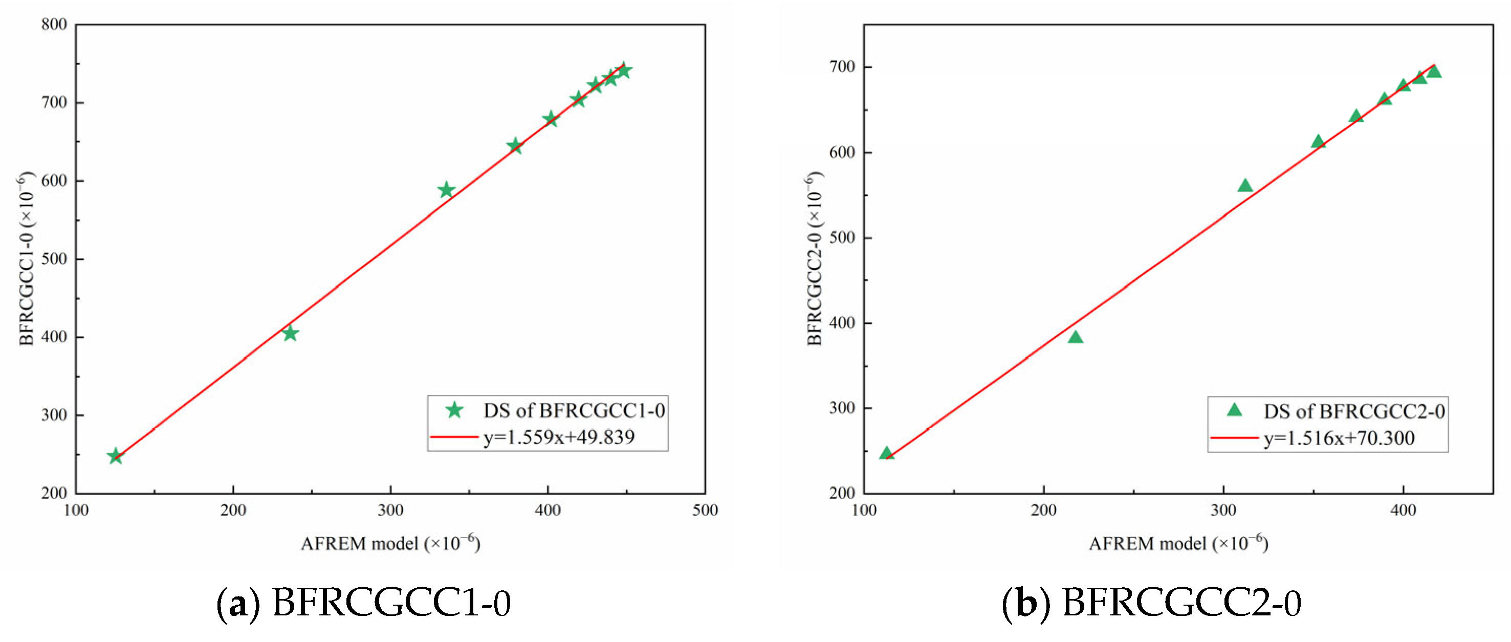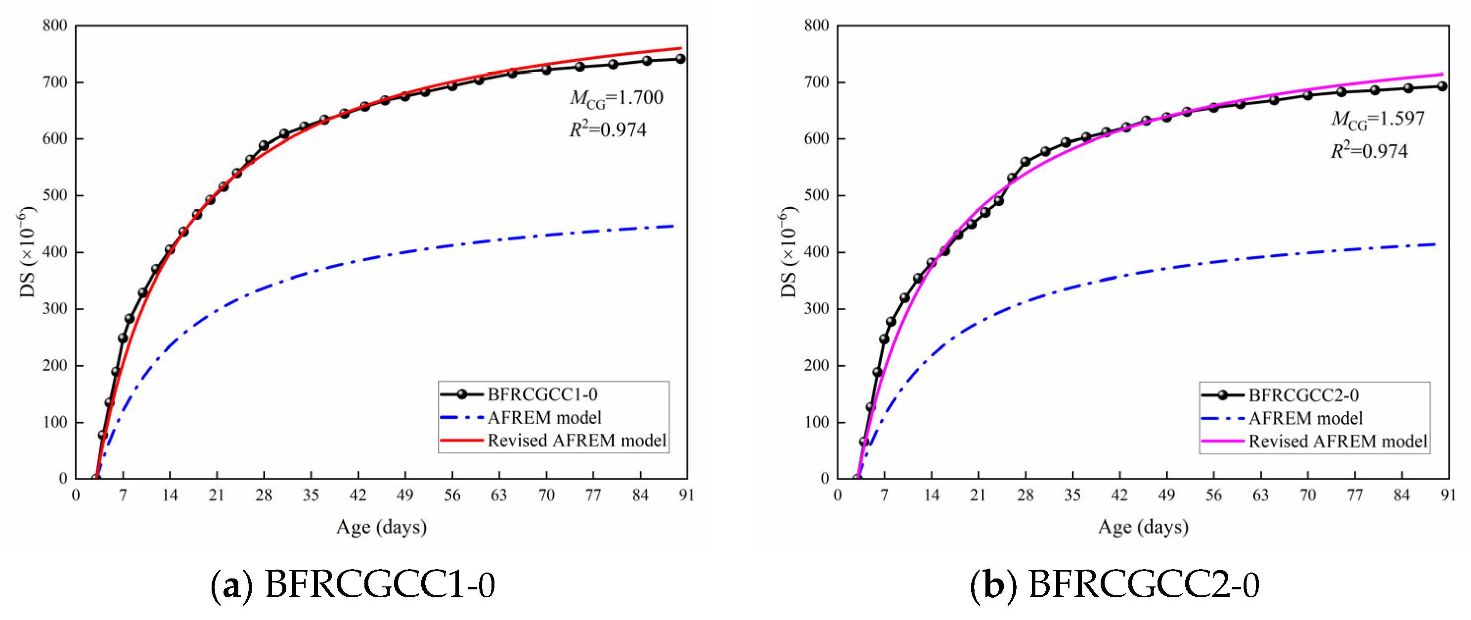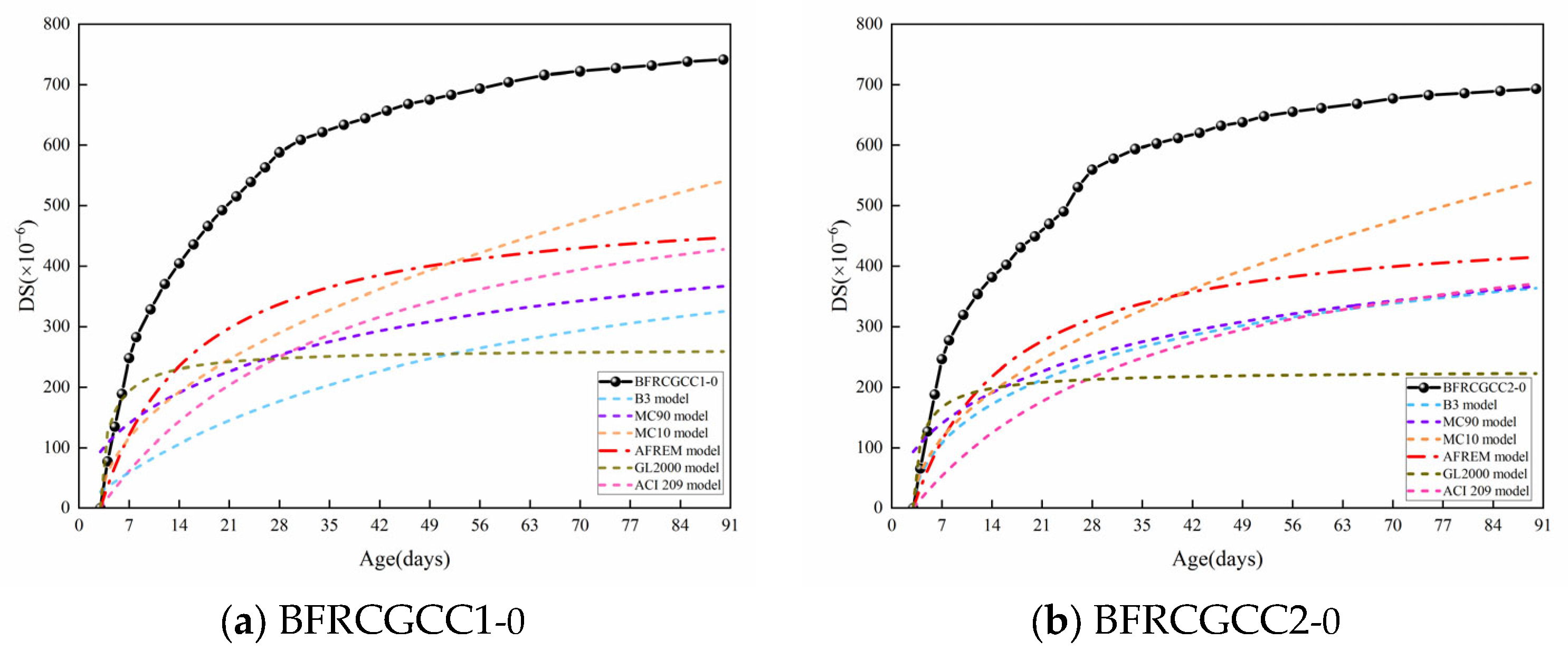 - The improved AFREM model’s predicted values of drying shrinkage are consistent with the test values, providing an effective tool for predicting drying shrinkage of the BFRCGCC. The findings can serve as a theoretical basis for shrinkage control and structural design of CGCC, offering significant technical guidance for engineering applications.