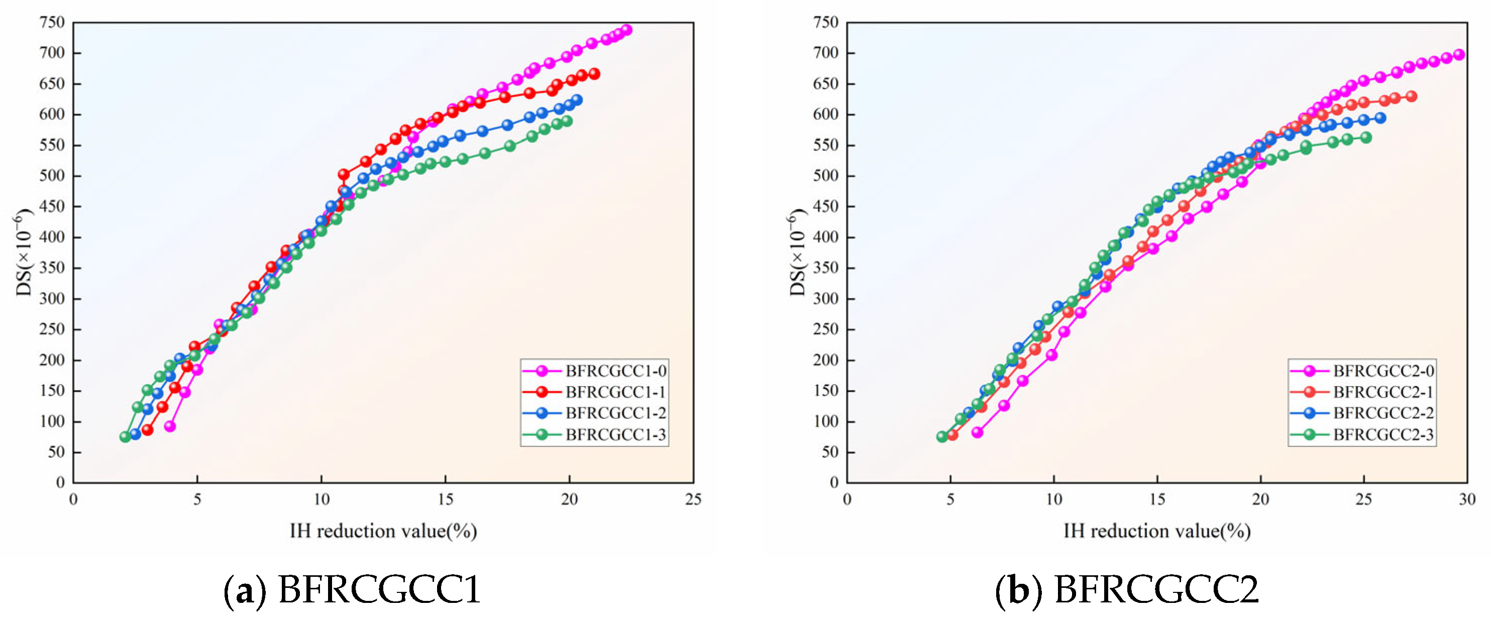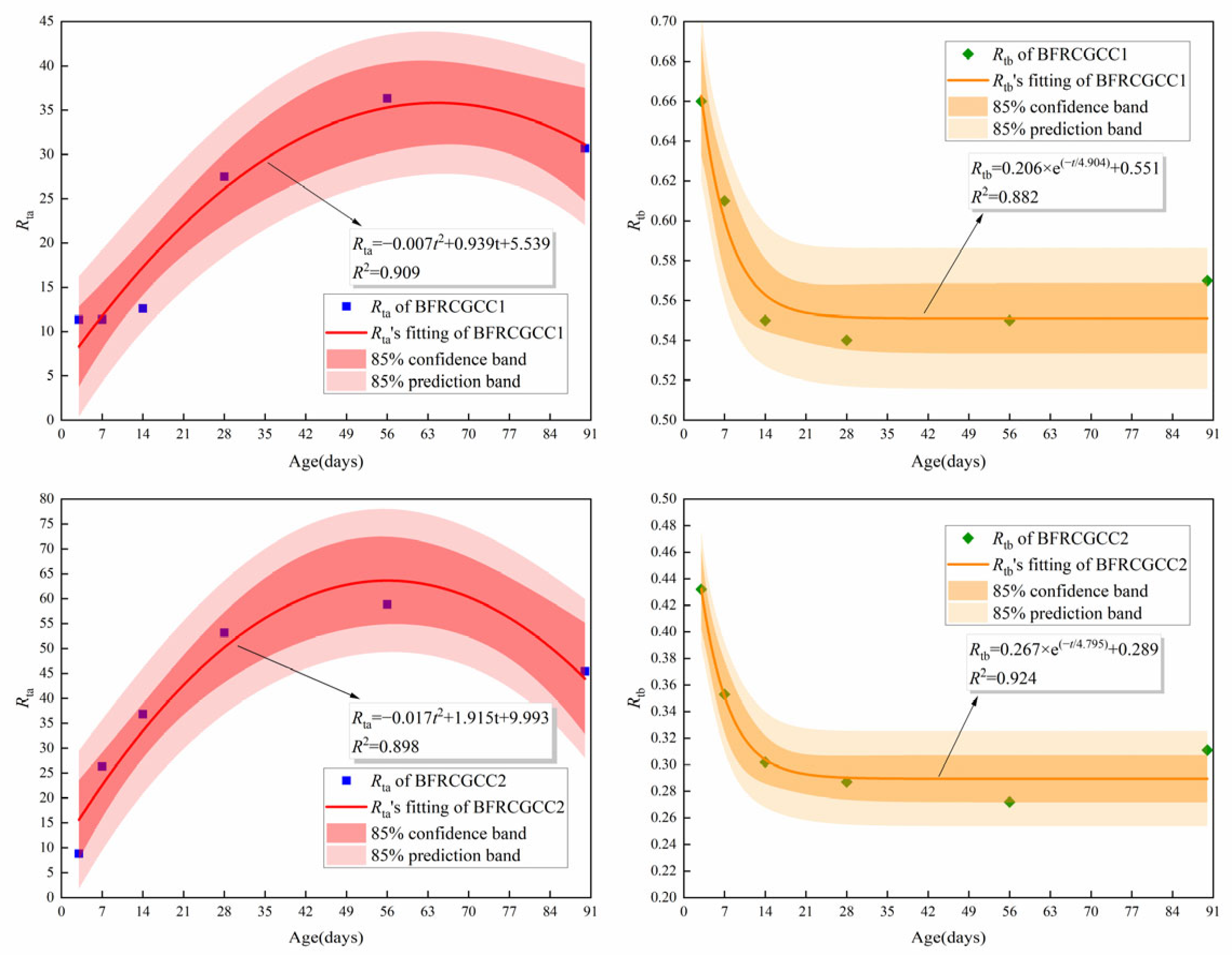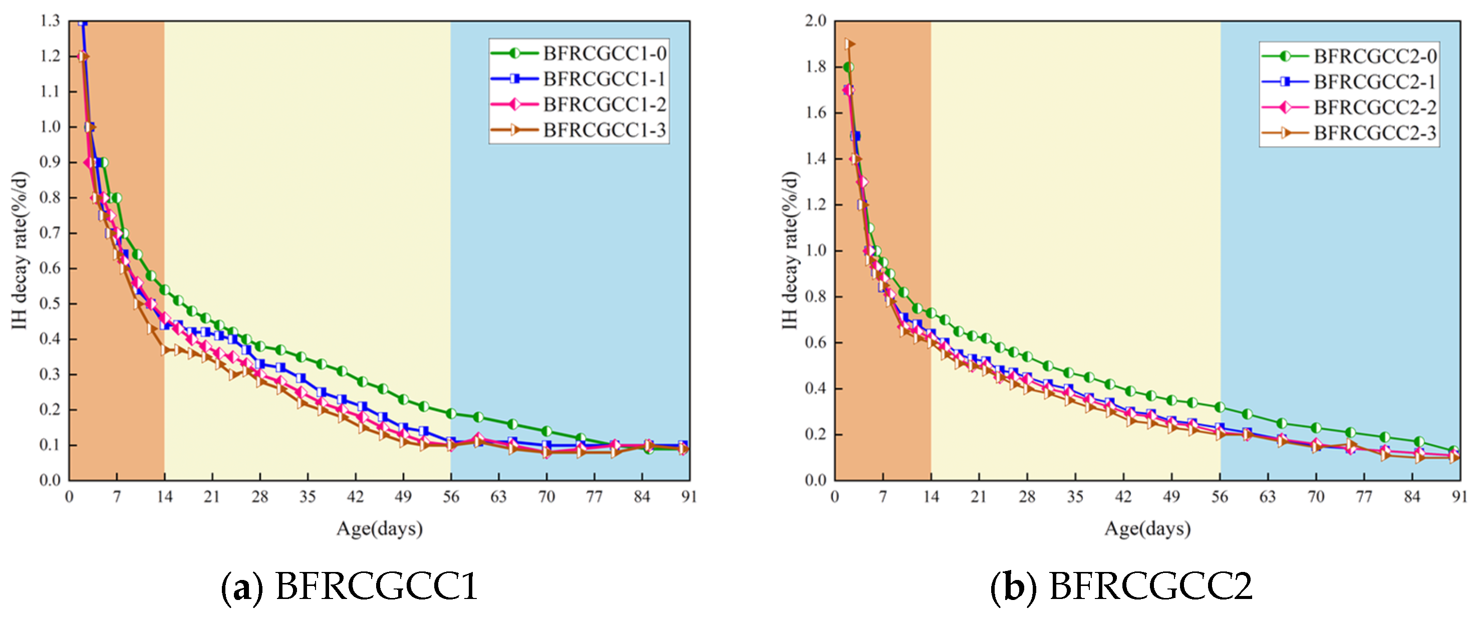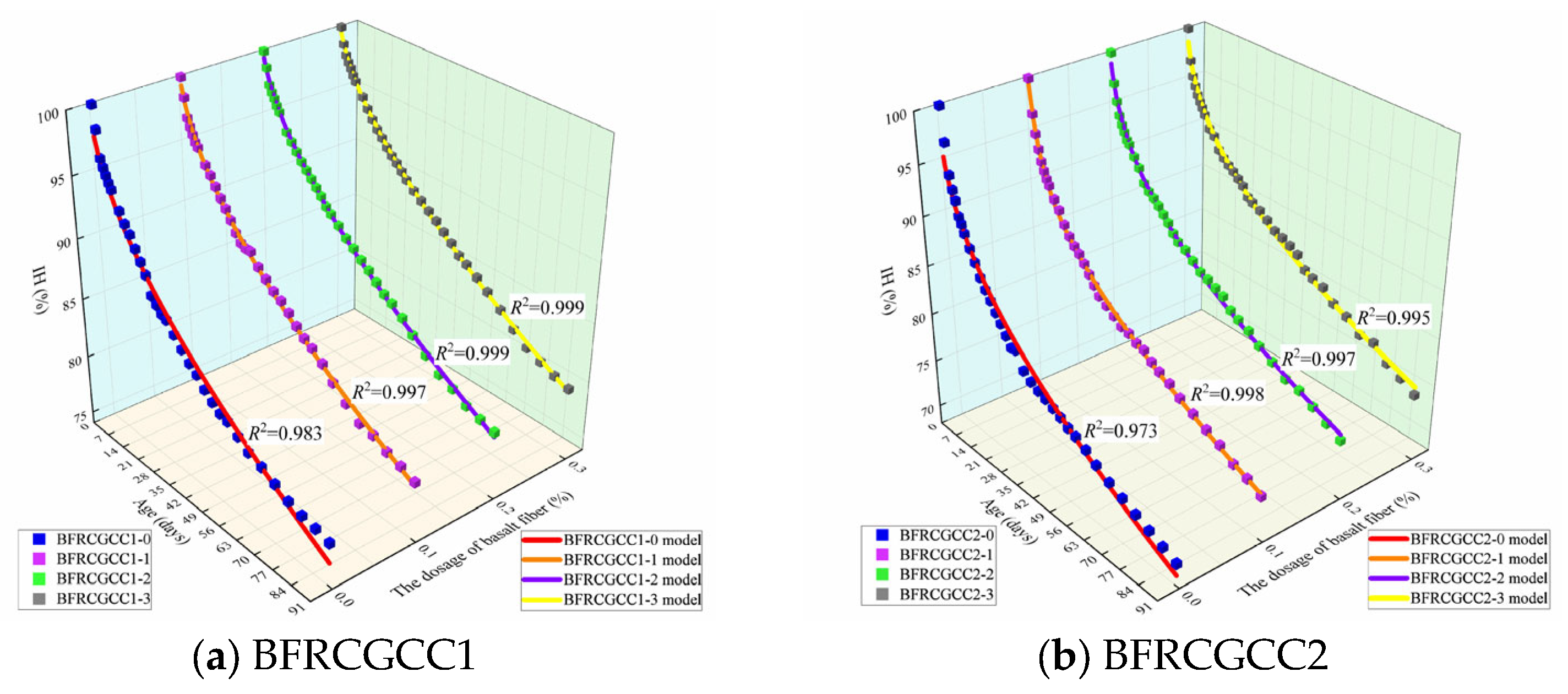 - The improved AFREM model’s predicted values of drying shrinkage are consistent with the test values, providing an effective tool for predicting drying shrinkage of the BFRCGCC. The findings can serve as a theoretical basis for shrinkage control and structural design of CGCC, offering significant technical guidance for engineering applications.