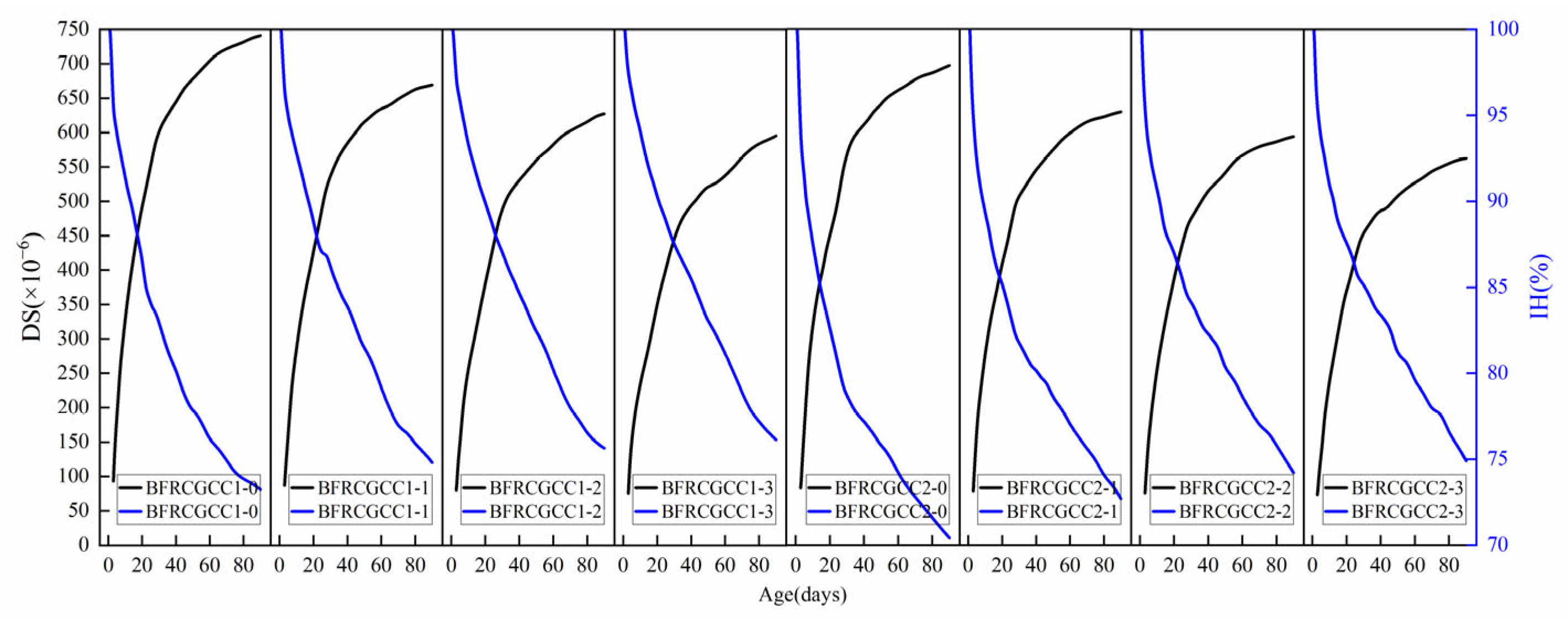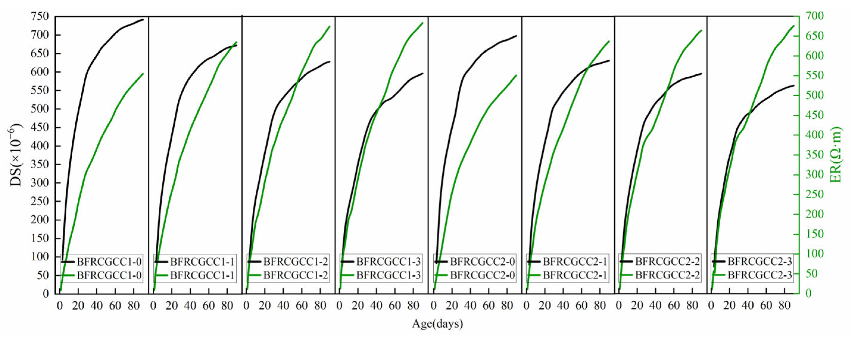 - Variations in the internal humidity and electrical resistivity of the concrete serve as indicators for the drying shrinkage of the matrix. The internal humidity and the electrical resistivity may be introduced to verify the drying shrinkage of BFRCGCC.