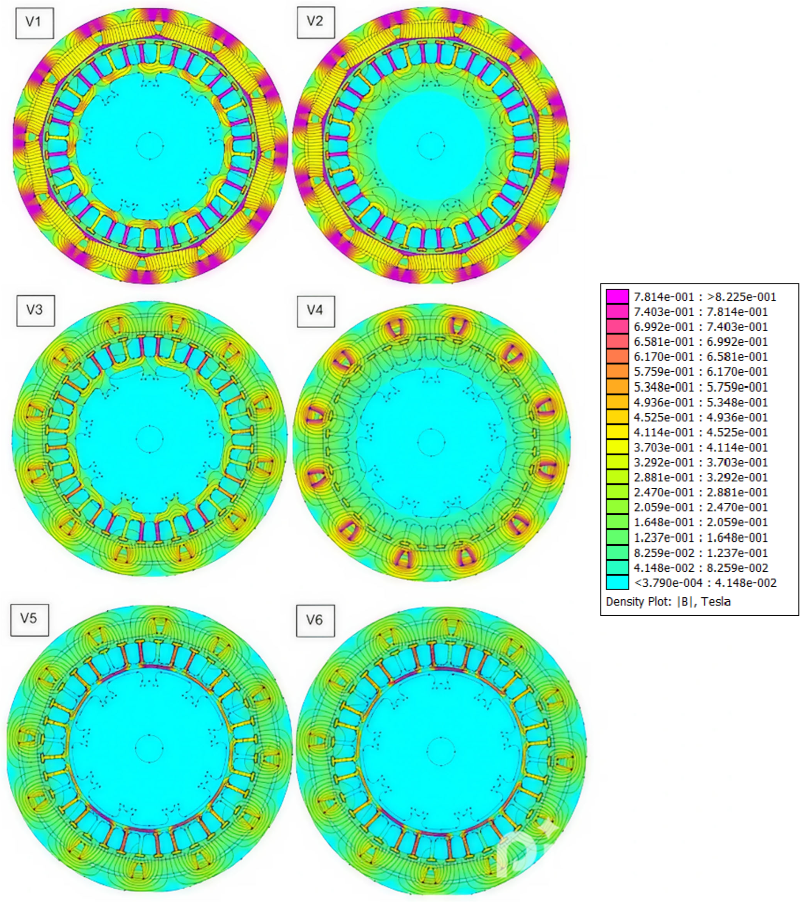 Figure 2 presents an example of the magnetic flux density distribution in the motor for all analyzed structural variants. In variant V1, the flux density map shows that the maximum induction in the stator teeth reaches approximately 1.83 T, which provides a safe margin below the saturation threshold of M19 steel (~2 T). In the rotor made of 1010 low-carbon steel, the magnetic induction falls within the range of 1.2–1.4 T, which helps to reduce hysteresis losses and allows for further design optimization (e.g., by in-creasing the number of turns or excitation current) without risking the loss of linear magnetic behavior.