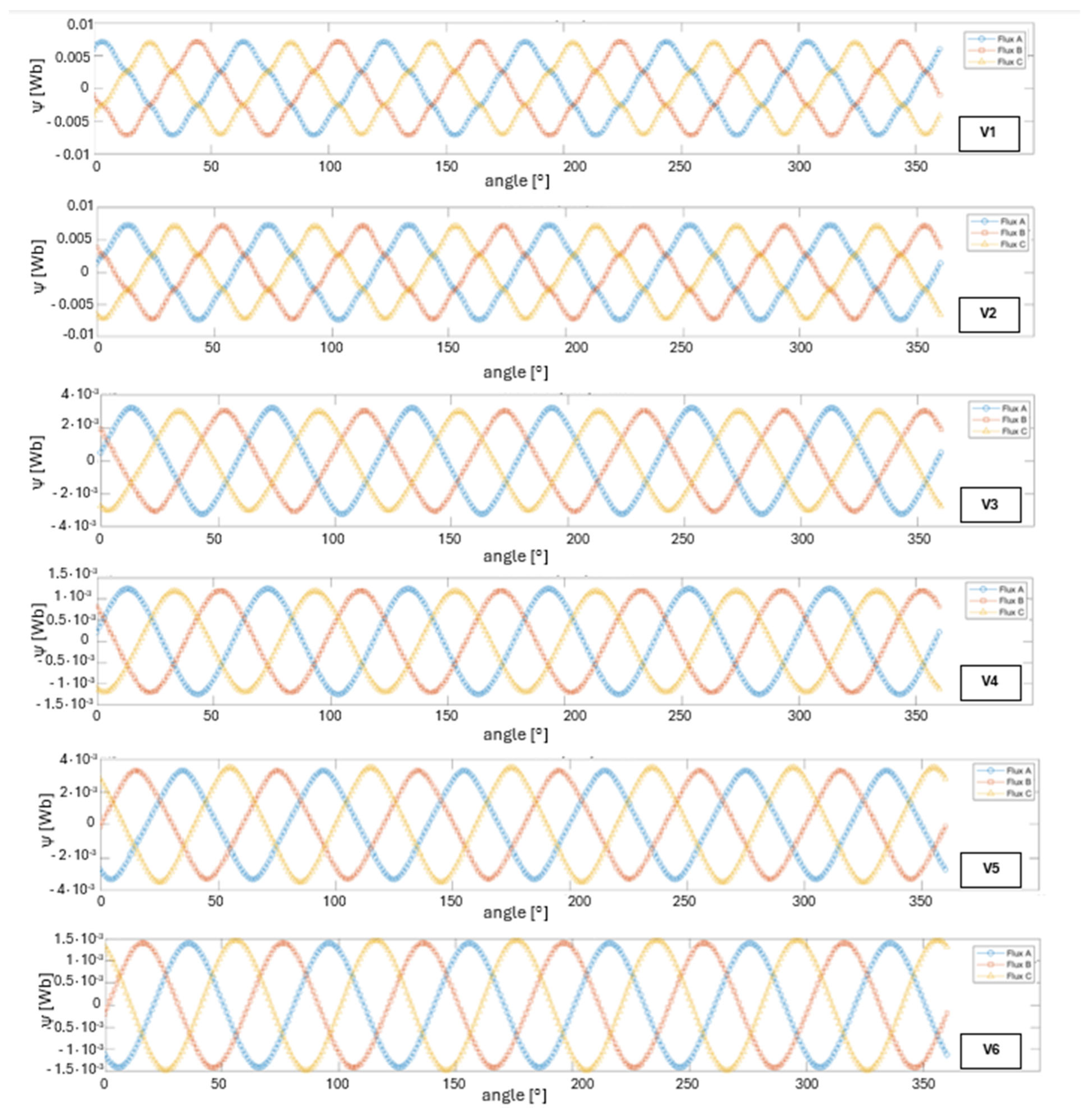 Figure 3 shows the flux linkage waveforms (Flux A, B, C) as a function of rotor angle for all analyzed structural variants. In variant V1, the magnetic flux linkage in each phase reaches an amplitude of approximately 7.1 mWb, corresponding to a peak-to-peak value of 14.2 mWb. The waveform shape is nearly perfectly sinusoidal.