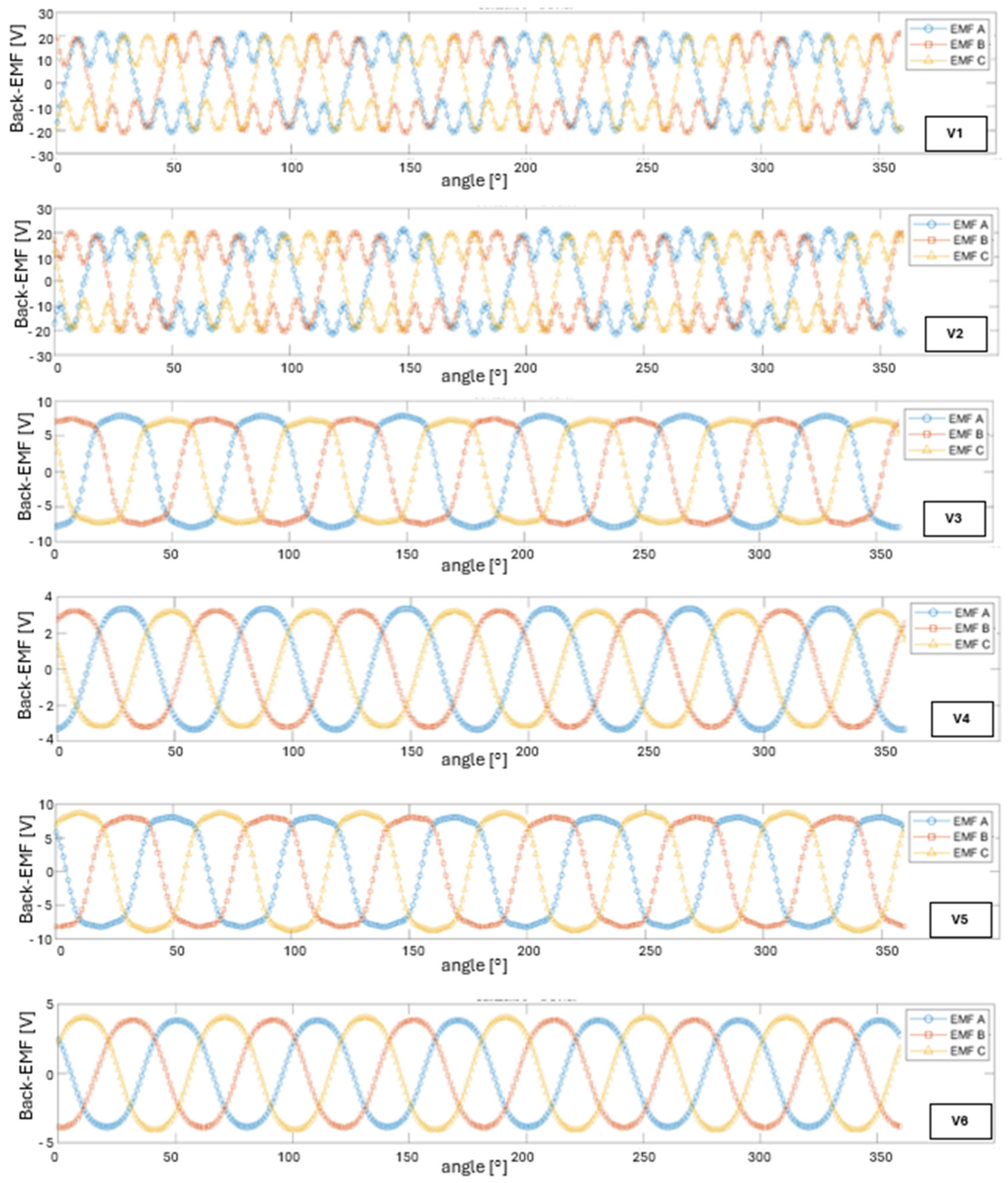 Figure 4 presents the back-EMF waveforms (phases A, B, and C) for all analyzed structural variants. In variant V1, peak values of ±19.5 V were recorded, which, at the given rotational speed, corresponds to a phase electromechanical constant of K