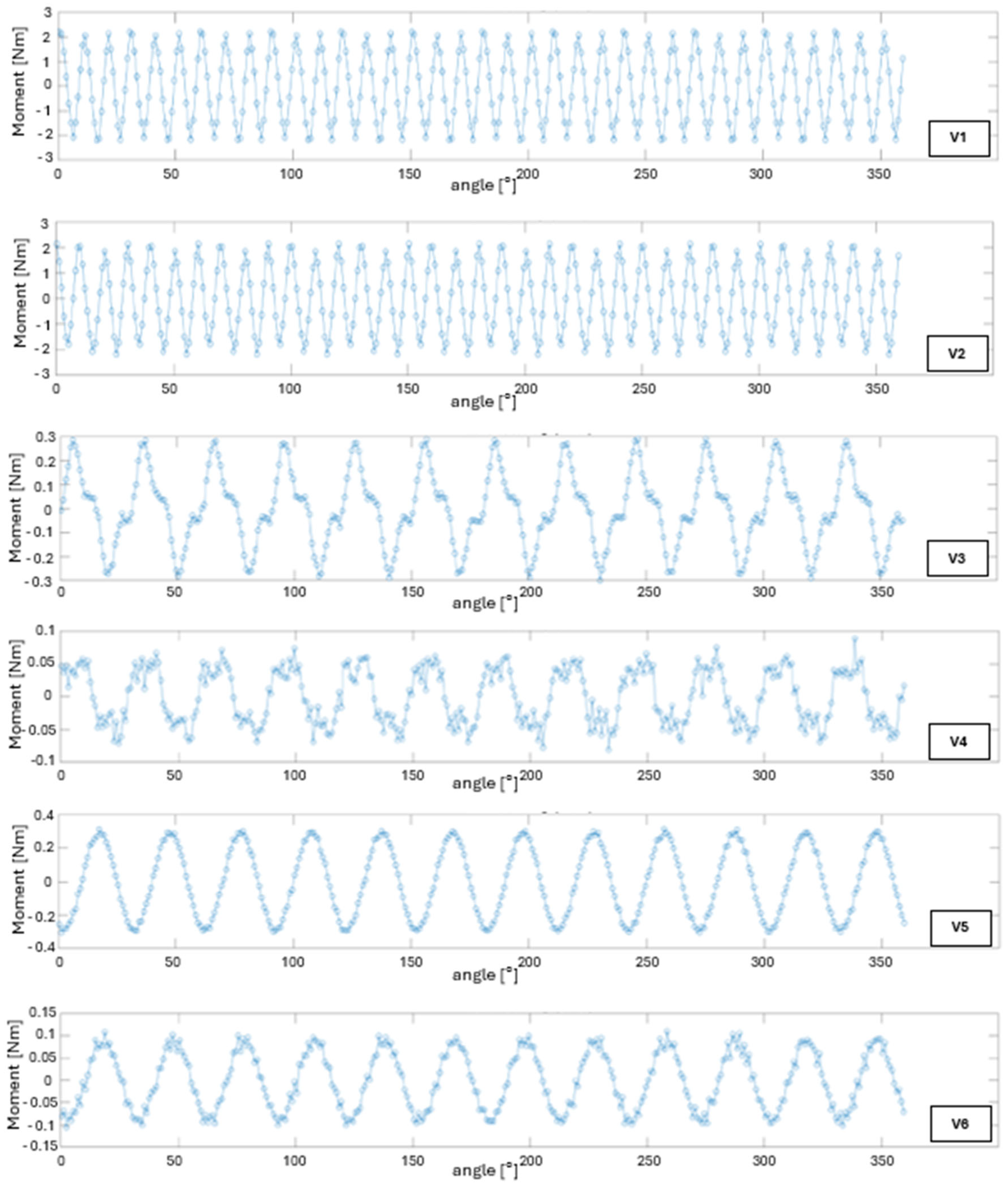 Variant V6 is characterized by instantaneous torque values of ±0.10 Nm (≈0.20 Nm pk–pk) and an average of approximately 0.02 Nm, which is twice the value of the ABS/ABS variant, but still lower than that of the PLA/ABS configuration. Although the torque ripple exceeds 100% of the average, it is slightly lower than in the fully polymer-based design.