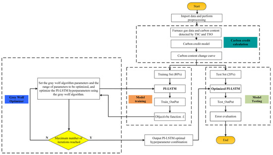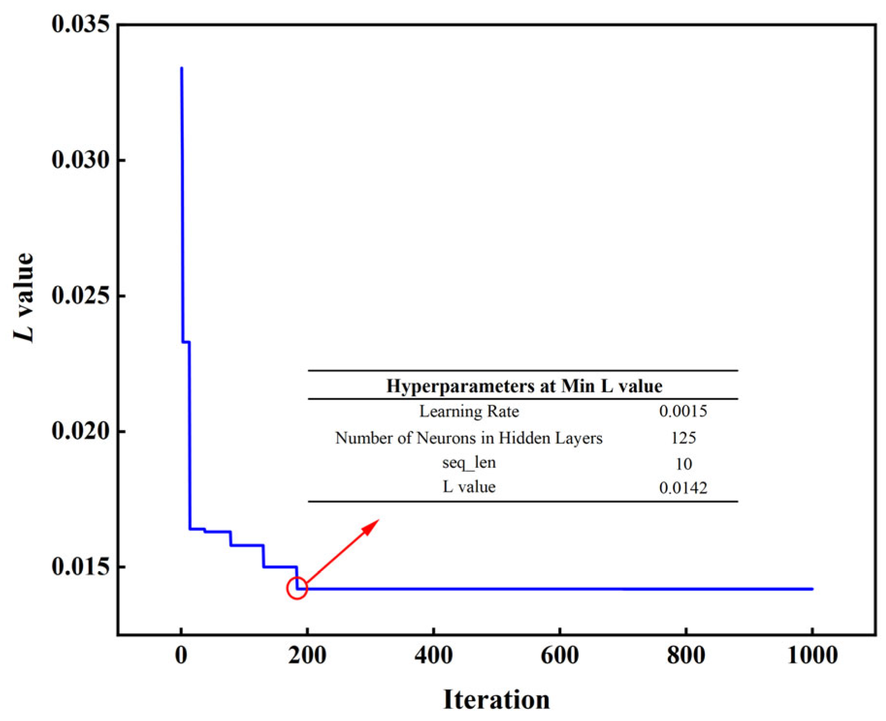 To enhance the convergence speed, predictive accuracy, and generalization performance of the PI-LSTM model, GWO is employed to tune the hyperparameters of LSTM, including learning rate, hidden layer neuron count, and sequence length (seq_len). The learning rate regulates the step size of weight adjustments in model training. If excessively large, it might lead to training oscillations or divergence; if overly small, convergence will be sluggish. The setting range is [0.0001, 0.1]. The number of neurons in the hidden layer determines the capacity and complexity of the LSTM network. Too few neurons may result in underfitting, unable to capture complex temporal patterns; too many may lead to overfitting. Considering model capacity and computational efficiency, the setting range is [10, 500]. The input sequence length in the sliding window mechanism affects the model’s ability to capture time dependencies. Too small a length may ignore long-term dependencies, while too large a length increases computational burden and may introduce noise. Based on the data sampling frequency (0.5 Hz, i.e., one sample every 2 s) and the duration of the reblowing stage of the converter furnace (1~3 min), the setting range is [1, 15]. The configuration of the GWO algorithm is as follows: the gray wolf population size is set to 30, the maximum iteration count is 1000, and the fitness function adopts the joint loss