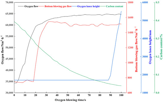 In Equation (2), represents the carbon content at time t, %; represents the total carbon content under initial conditions, kg; represents the molten steel mass, kg.