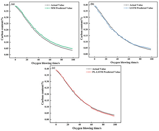 Tests on converter data showed that the MAE of PI-LSTM was 0.0077, a 55.2% reduction compared to the MAE of the mechanism model (0.0172) and a 21.4% reduction compared to the MAE of LSTM (0.0098). The hit rate for endpoint carbon content within a ±0.01% error range reached 82.23%, significantly outperforming the comparison models, and the prediction curve accurately tracked the dynamic changes in carbon content, consistent with the physical laws of the three-stage decarburization theory.