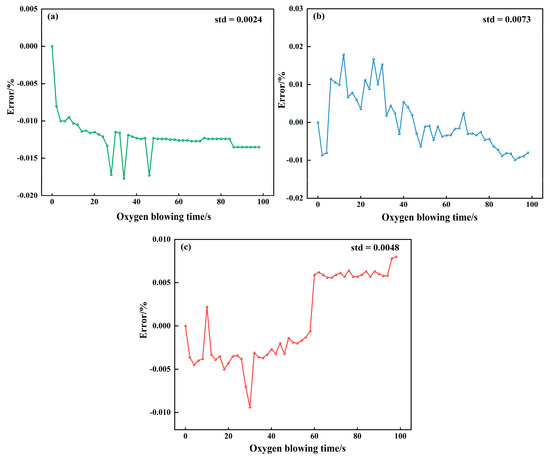 Figure 11a), it can be seen that although the model optimizes the key parameters in the decarbonization process using GWO, it is difficult to adapt to the dynamic changes in real-time smelting conditions, resulting in significant numerical deviations between the predicted curve and the actual value. It cannot capture the short-term fluctuations in carbon content caused by operations such as oxygen lance adjustment and bottom blowing flow rate fluctuations, and has a significant deviation from the actual value. Considering the typical heat error curve (