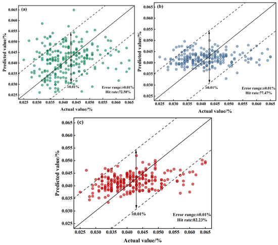 Figure 13a) shows that the predicted results are relatively scattered, with some points exceeding the ±0.01% error range. This reflects that although the mechanism model can follow the overall decarbonization law, it is difficult to adapt to the differences in smelting conditions of different furnaces, and its performance is limited in high-precision control scenarios.