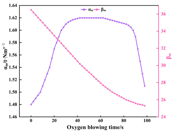 37]. Its trend precisely responded to operational adjustments: it rose steadily from 0 to 20 s as oxygen supply intensity increased, reflecting enhanced oxygen utilization efficiency; reaching a peak and maintaining high levels during the stable operation period from 20 to 80 s; then steadily decreasing from 80 to 100 s as the oxygen lance was raised and oxygen supply weakened, aligning with the requirements of the diffusion-controlled phase in the late blowing stage. βₘ ranged between [25.2, 36.5], fully consistent with the expected range of βₘ ∈ [20, 40] reported in reference [