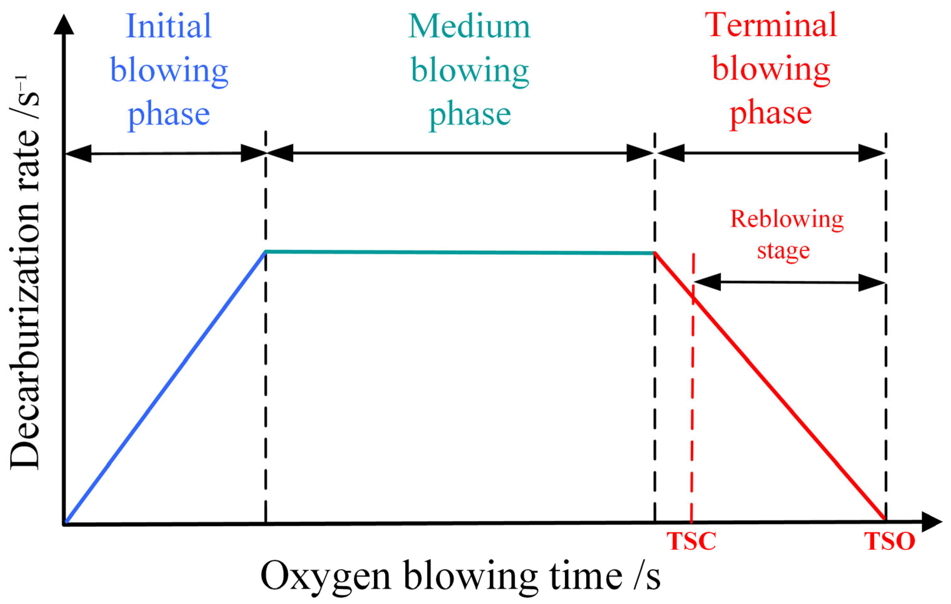 Based on the stage-specific characteristics of decarburization kinetics during the converter blowing process, the decarburization process falls into three phases: the initial phase, the middle phase, and the terminal phase of blowing [