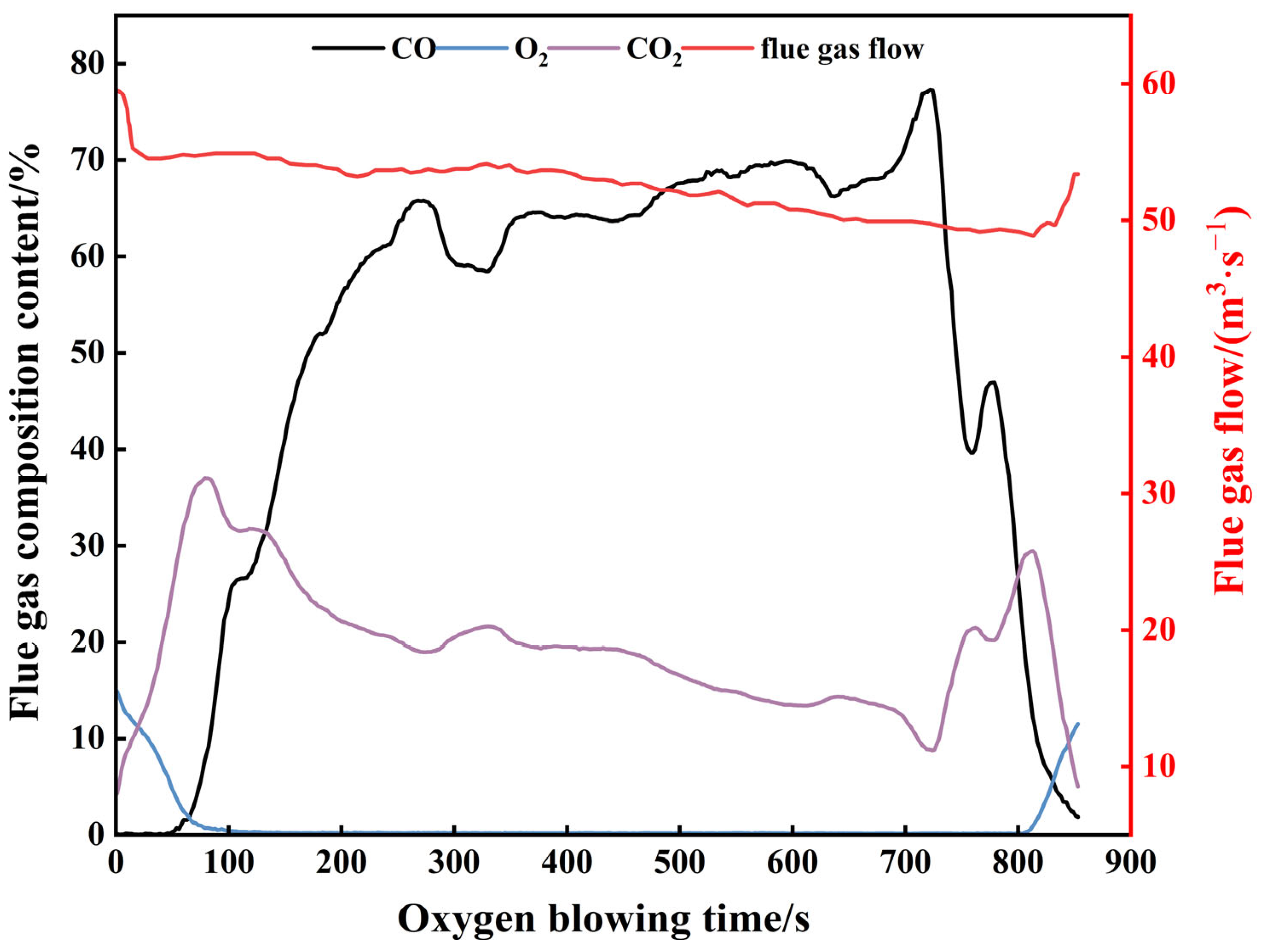 Key components of the flue gas and variations in flue gas flow rate in the converter smelting process are illustrated in
