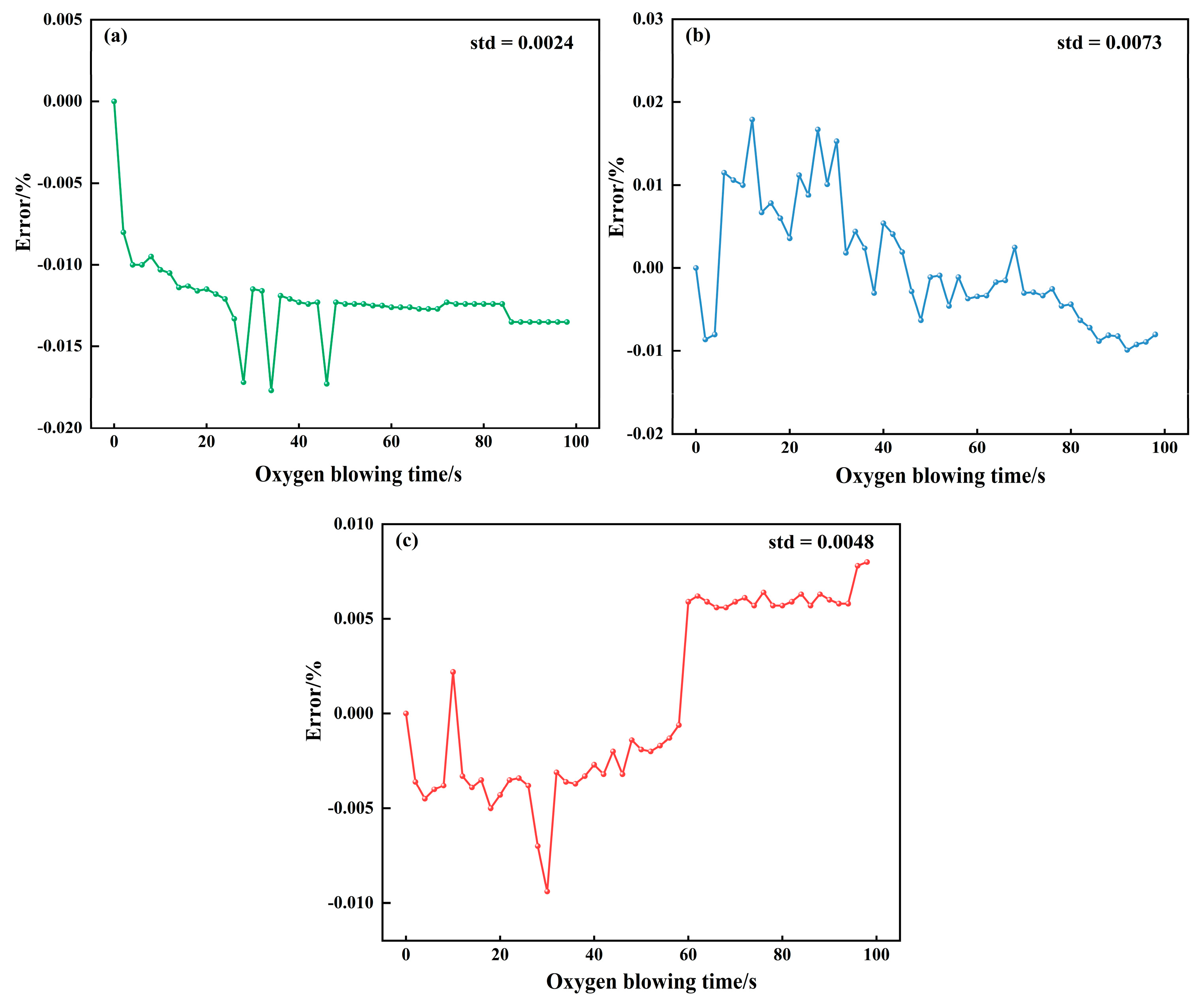 In the carbon content prediction model for the second blowing stage of the converter, the carbon content at the TSC time and the molten steel weight are two irreplaceable key input parameters. Measurement errors in these parameters directly determine the accuracy of the model’s initial inputs and the reliability of subsequent predictions. Industrial TSC carbon content is measured by auxiliary guns, introducing systematic errors. Additionally, random errors may arise from variations in auxiliary gun insertion depth and molten pool inhomogeneity during actual smelting. This makes carbon content one of the single-valued parameters in model inputs that exhibit high sensitivity to prediction outcomes. Industrial molten steel weight is indirectly calculated from the charge ratio of pig iron and scrap steel, making it susceptible to errors due to weighing accuracy during charging—a parameter prone to inaccuracies within initial material conditions.