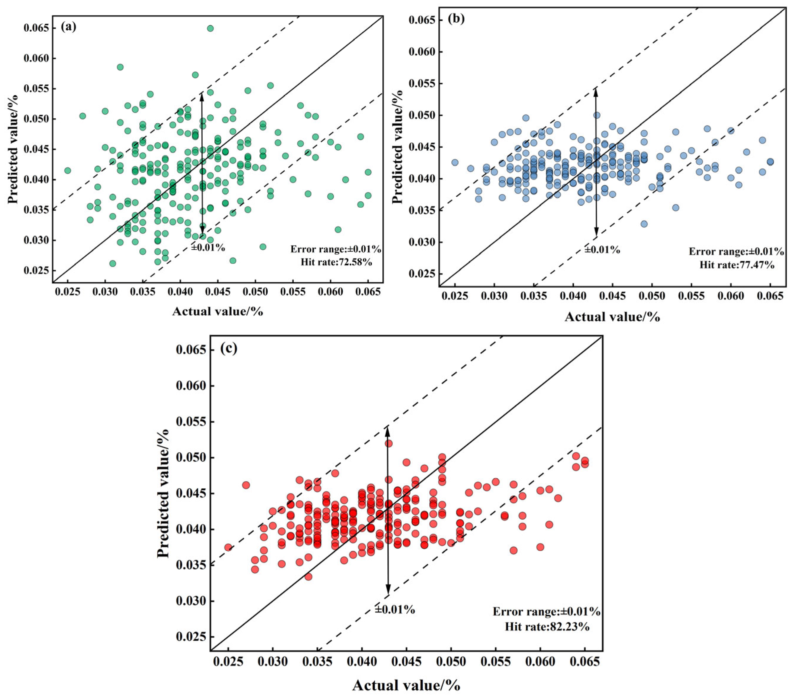 In Equations (22)–(24), represents the actual carbon content value, represents the model-predicted carbon content value, represents the number of furnaces where the absolute value of the difference between the predicted endpoint carbon content and the TSO carbon content does not exceed ±0.005%, ±0.01%, or ±0.015%; and n represents the total number of heats participating in the model prediction.