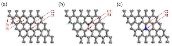 Geometrically optimized structures of (a) pure graphene, (b) B-doped graphene, and (c) N-doped graphene (h, b, and t refer to hollow sites, bridge sites, and top sites, respectively; pink for the B atom and blue for the N atom).