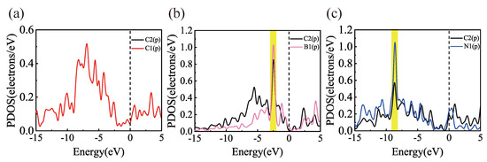 To compare and analyze the results in the literature and verify the correctness of the calculation model, the geometrically optimized structures of Gr, BGr, and NGr are first calculated in this paper, as shown in Figure 1. The C1–C2 bond length in pristine graphene is 1.43 Å. Upon B and N doping, the calculated B1–C2 and N1–C2 distances increase to 1.49 Å and 1.44 Å, respectively, in good agreement with literature results [27,43,44,45,46]. To explain the interactions of doped B and N in graphene, the partial density of states (PDOS) is calculated, as shown in Figure 2. For Gr, the p orbitals of C1 and C2 have a strong hybridization. After B and N doping, the hybrid range of the p orbitals of B1 and C2 is between −2.0 eV and −3.0 eV. The hybrid range of the p orbitals of N1 and C2 is between −8.0 eV and −9.0 eV. As reported previously [47], this agrees with previous findings. Based on the above results, the calculation model, the method, and the parameter settings used in this study are reliable.