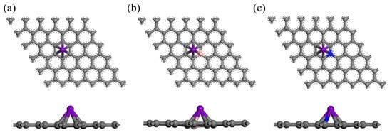 Geometrically optimized structures of transition metal-modified (a) pure graphene, (b) B-doped graphene, and (c) N-doped graphene (purple indicates transition metal).