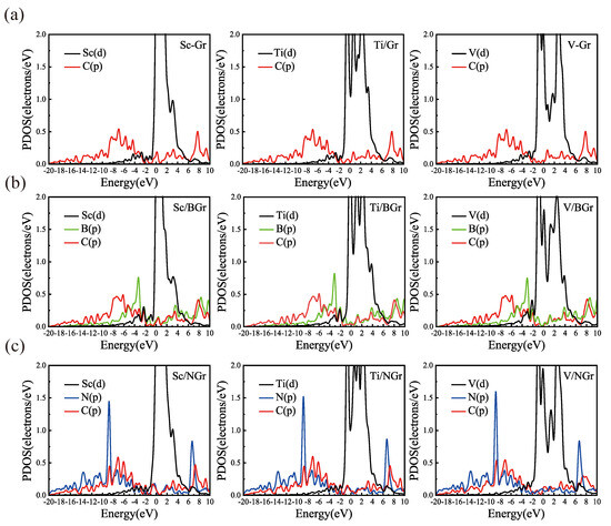 As shown in Figure 4, PDOS of Sc-, Ti-, and V-modified pure, B-doped, and N-doped graphene systems are calculated. It can be seen from the figure that there is a specific orbital hybridization between transition metals and pure/doped graphene. This result indicates that B and N doping change the electronic structure of pure graphene. In the pure graphene system, the 2p orbitals of C atoms and the 3d orbitals of Sc, Ti, and V show significant overlap at around −2.0 eV. This resonance effectively enhances the interactions between the metal and the base material. For B-doped and N-doped graphene, the Fermi level of the BGr shifts toward the valence band due to electron deletion near the B atom that is transferred to the carbon atom. While the N atom gains electrons from the neighboring carbon atom on graphene, the Fermi level of the NGr moves toward the conduction band. In addition, B-doped graphene has a more substantial resonance peak between the 2p orbitals of C and the transition metals in the range of −2.0 to −3.0 eV. Furthermore, this resonance peak is higher than that in pure and N-doped graphene, indicating that Sc, Ti, and V form stronger bonds with the B-doped graphene substrate. This result thoroughly verifies that B doping is the main reason for enhancing the binding of transition metal atoms to graphene.