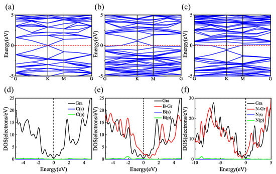 Band structure of (a) pure graphene, (b) B-doped graphene, and (c) N-doped graphene, and DOS diagrams of (d) pure graphene, (e) B-doped graphene, and (f) N-doped graphene.