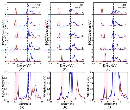 To analyze the interactions between Sc, Ti, and V and the adsorbed H2 molecules in the studied system, the PDOS diagrams of H2 molecules and Sc, Ti, and V are provided in Figure 7. As seen in Figure 7, the 1s orbitals of H2 and the 3d orbitals of Sc, Ti, and V all exhibit orbital hybridization, suggesting a significant interaction between them. As shown in Figure 7A–C, after the adsorption of the third H2 molecule, the 1s orbitals of the H2 molecule exhibit broadening near −8.0, −8.0, and −7.5 eV, respectively. This broadening phenomenon indicates interactions between adsorbed H2 molecules. In addition, orbital coupling between the 1s orbitals of H2 and the 3d orbitals of Sc, Ti, and V can be observed in the range of −1.0~0.0 eV in the adsorption of the 1st to 4th H2 molecules. This result illustrates the strong hybridization of Kubas [54]. As shown in Figure 7a, the anti-bonding orbitals of the fifth H2 molecule and the 3d orbital of the Sc atom exhibit weak orbital coupling at the Fermi level, suggesting that there is only a weak polarization interaction between them. As shown in Figure 7b,c, the anti-bonding orbitals of the fifth H2 molecule and the 3d orbitals of the Ti and V atoms show the minimal band expansion or orbital coupling near the Fermi level, indicating no interactions between them.