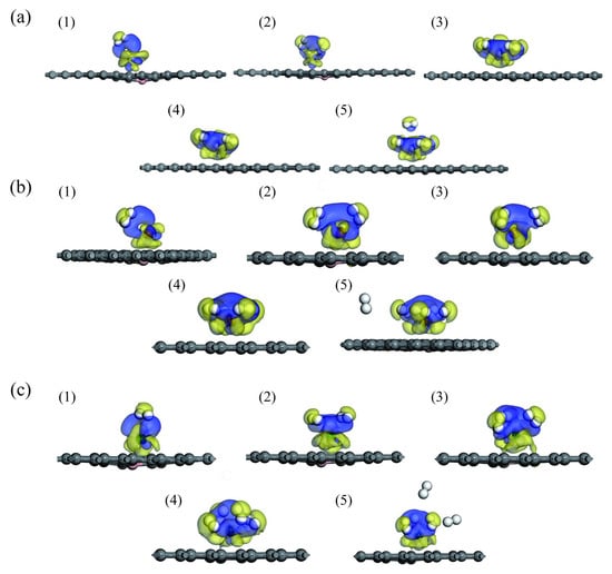 As seen in Figure 8a(5), the charge gain and loss of the fifth H2 molecule are relatively small and independent, indicating that the adsorption strength of this H2 molecule is weak. Adsorption results from polarization caused by the electric field. As shown in Figure 8b(5), there is no charge accumulation or reduction around the fifth H2 molecule. Combined with the adsorption energy parameters of the H2 molecule in Table 2, this reveals that the adsorption strength of the fifth H2 molecule in the system is very weak. Similarly, as seen in Figure 8c(5), no charge accumulation or decrease is observed around the fifth H2 molecule. The adsorption energy data in Table 2 further suggest that the fifth H2 molecule cannot be adsorbed into the system.