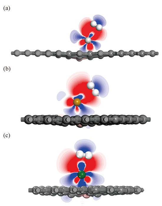 To better understand the adsorption mechanism, this paper analyzes the electronic difference density (EDD) diagrams for H2 adsorption in Sc-, Ti-, and V-modified B-doped graphene systems, as shown in Figure 8. The yellow and blue isoplanes visually show the regions of charge loss and accumulation, respectively, with isoplanes in units of 0.02 e/Å3. Mulliken charge layouts before and after each system’s adsorption of one H2 molecule are listed in Table 3. H2 molecules obtained more electron transfer in the Sc-BGr system, further confirming the results from the adsorption energy and PDOS analysis. Based on Mulliken layout analysis and Figure 8, transition metal atoms and the base material are positively and negatively charged, respectively, indicating that charge transfer exists between them. An electric field is generated between the transition metal atoms and the base material, which polarizes the H2 molecule. According to molecular orbital theory, in an isolated H2 molecule, the 1s orbitals of the two hydrogen atoms form bonding orbitals and antibonding orbitals. By analyzing the EDD diagram, it is found that the charge reduction region lies between two H atoms, reflecting the orbital of the H2 molecule. The region around which the charge accumulates is the orbital of the H2 molecule. Additionally, transition metal atoms have both accumulation and decrease regions around them. These results indicate that the orbital of the H2 molecule loses electrons, which are transferred to the transition metal atom with an unfilled d orbital. Simultaneously, electrons from the d orbital of the transition metal atom are transferred to the antibonding orbital of the H2 molecule, forming a feedback bond. Figure 9 shows the two-dimensional planar EDD diagrams of the first H2 molecule adsorption in three systems, from which Kubas’ effect can be clearly observed. Therefore, the adsorption mechanism of H2 molecules in Sc-BGr, Ti-BGr, and V-BGr systems mainly involves two aspects. First, the orbital interactions between H2 and Sc, Ti, and V play a key role. Second, the electrostatic field generated between Sc, Ti, and V and the substrate material causes polarization of H2 molecules, which in turn creates a Coulomb attraction between the negatively charged H2 molecules and the positively charged Sc, Ti, and V.
