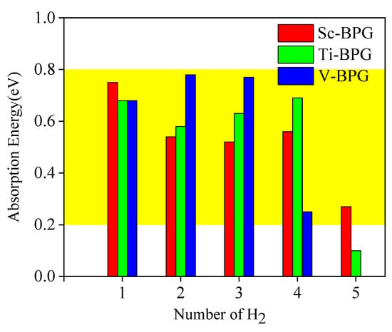 As shown in Figure 10, the adsorption energy parameters of H2 molecules in the Sc-BGr, Ti-BGr, and V-BGr systems are presented. The yellow region in the figure represents the optimal energy adsorption range (−0.2 to −0.8 eV) for efficient hydrogen storage [29,55]. Based on Figure 7A, Figure 8a and Figure 10, it can be observed that the Sc-BGr system is capable of reversibly and stably adsorbing up to 5 H2 molecules. The average adsorption energy is −0.528 eV/H2, which indicates a high hydrogen absorption rate. The hydrogen storage density of the Sc atom on BPG is the highest, at 1.54 wt.%, which is 25% higher than the hydrogen storage mass density of the other two metals (Ti, V) when they are modified on B-doped graphene. Therefore, the Sc-BGr system’s hydrogen storage performance is superior.