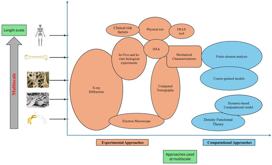 Multiscale predictive approaches (experimental and computational) that are used to analyze the bone fragility and strength at the different scales of the bone (molecular, cellular, tissue, organ, and whole body scale) (Derived from [21]).