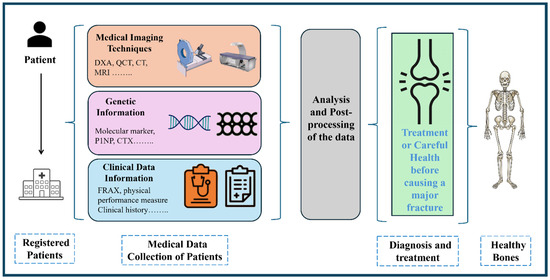 At the systems level, clinical and biochemical data—such as serum markers of bone turnover (e.g., P1NP, CTX) [135], inflammatory cytokines, sex hormones, and comorbidities are integrated to contextualize localized fragility within an individual’s overall physiological and metabolic milieu. Machine learning algorithms, particularly deep neural networks [136], facilitate the integration and interpretation of these multiscale datasets by learning latent features and inter-scale dependencies that are predictive of fracture risk. These models are trained on annotated datasets and validated against prospective fracture outcomes to establish their diagnostic and prognostic performance.