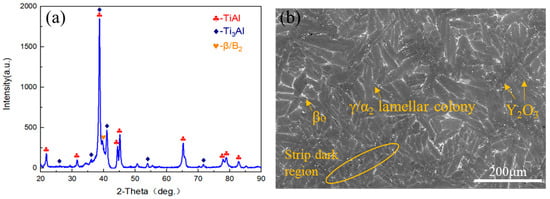 Microstructures of the as-cast TiAl alloy. (a) XRD patterns; (b) SEM image.